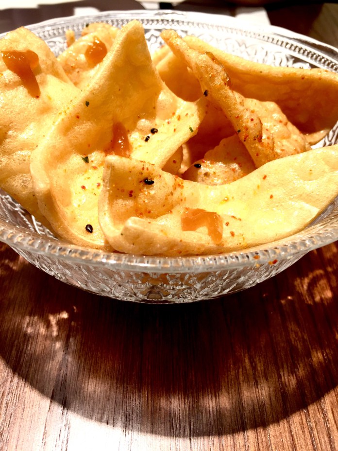 -Pollo al limón XO: pepitora japonesa de pasta de soja, bergamota y cinco especias chinas es refrescante, crujiente y bello con sus flores de ajo y el evanescente aire de limón. Los muslitos se mojan en la salsa y se deslizan en la boca en un crujir de pieles churruscantes.