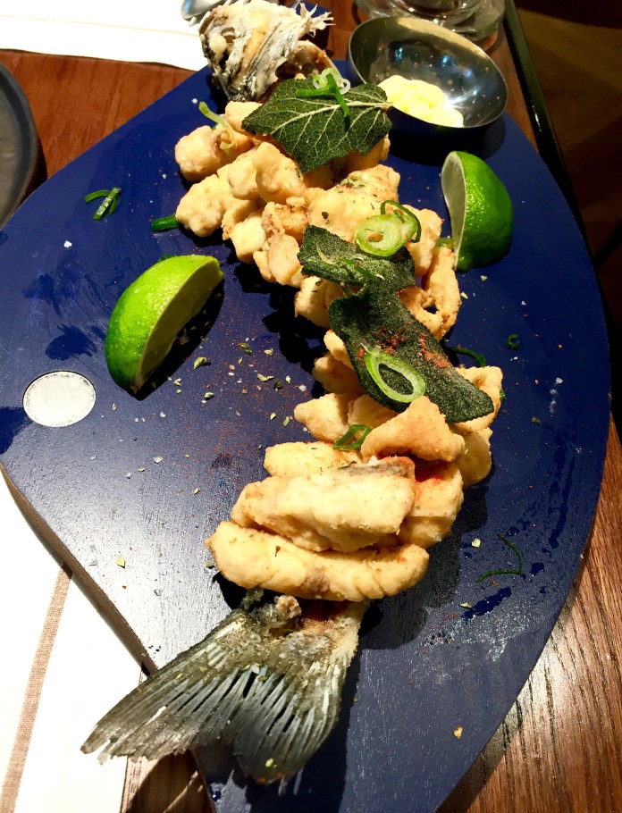 La lubina frita es entera pero se sirve en pequeños trozos. Está frita y previamente adobada. Muy bien aliñada, pero sobre todo magníficamente frita, crepitante, dorada y sin gota de grasa. Parece fácil pero no lo es. Se puede mojar en un suave alioli pero no hace falta. Tiene además unas pocas, muy pocas, hojas de salvia fritas que están excelentes.