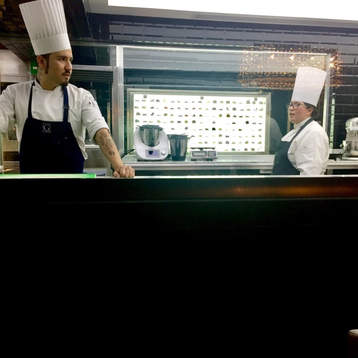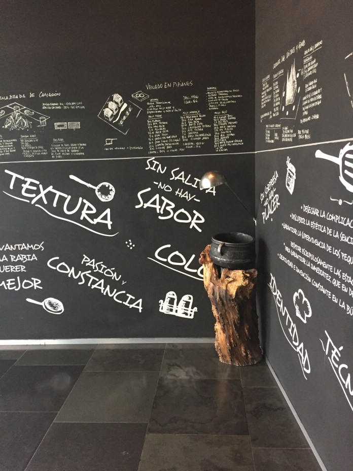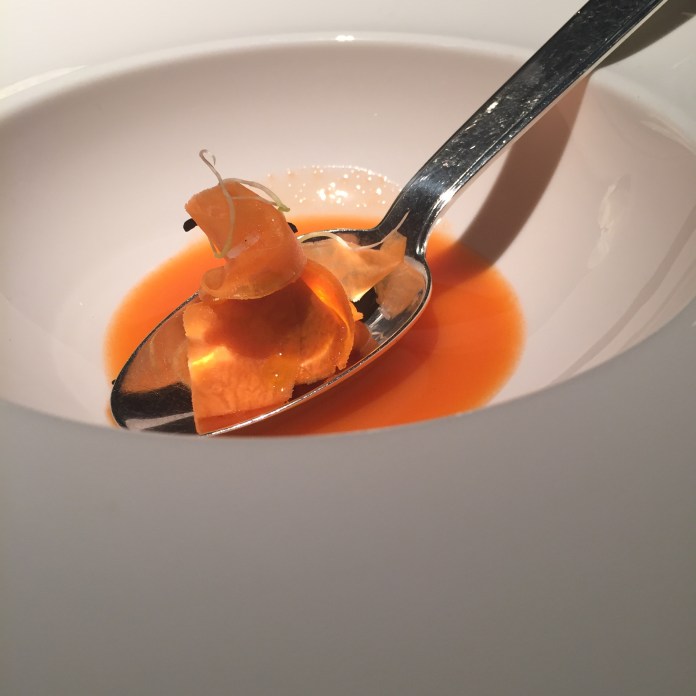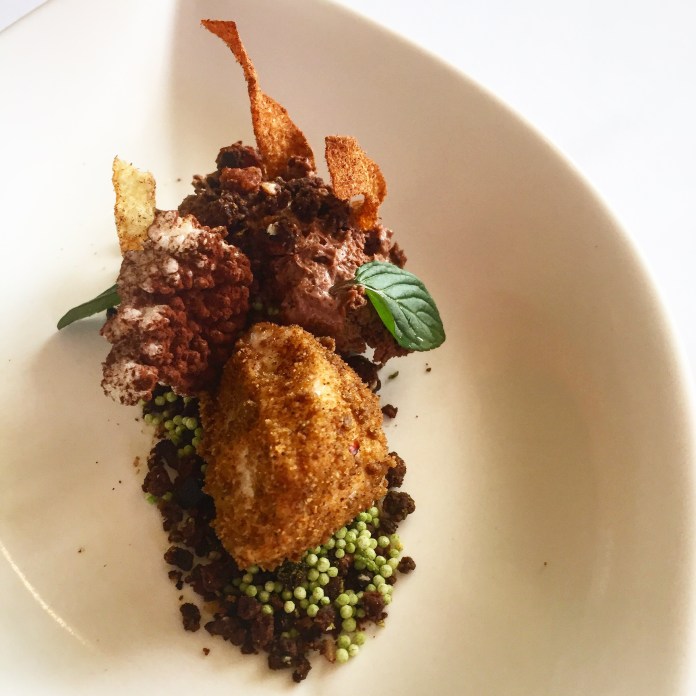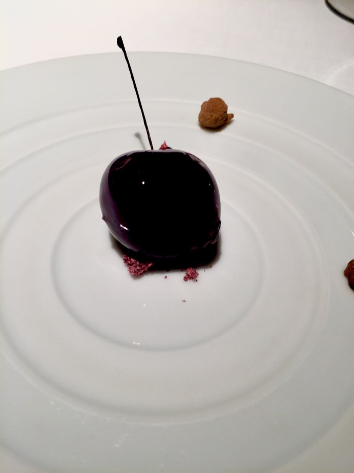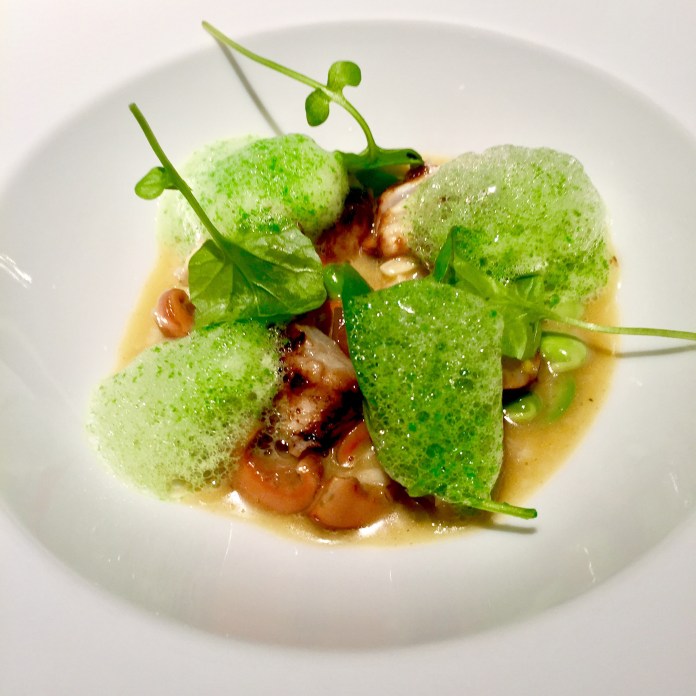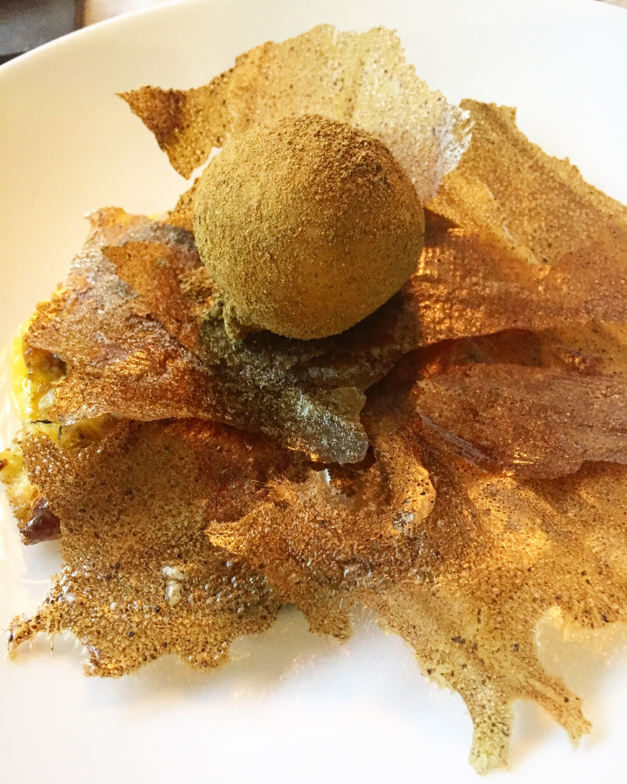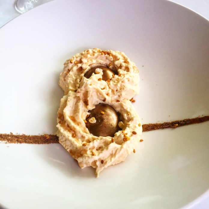 También los postres tienen gran nivel. Las esferas de chocolate con mole tienen un sabor fuerte que casi deja sin aliento, aún más que el estallido que producen en la boca. La espuma de oloroso es como un zabaglione esponjoso en el que el polvo de bronce embellece enormemente el plato.