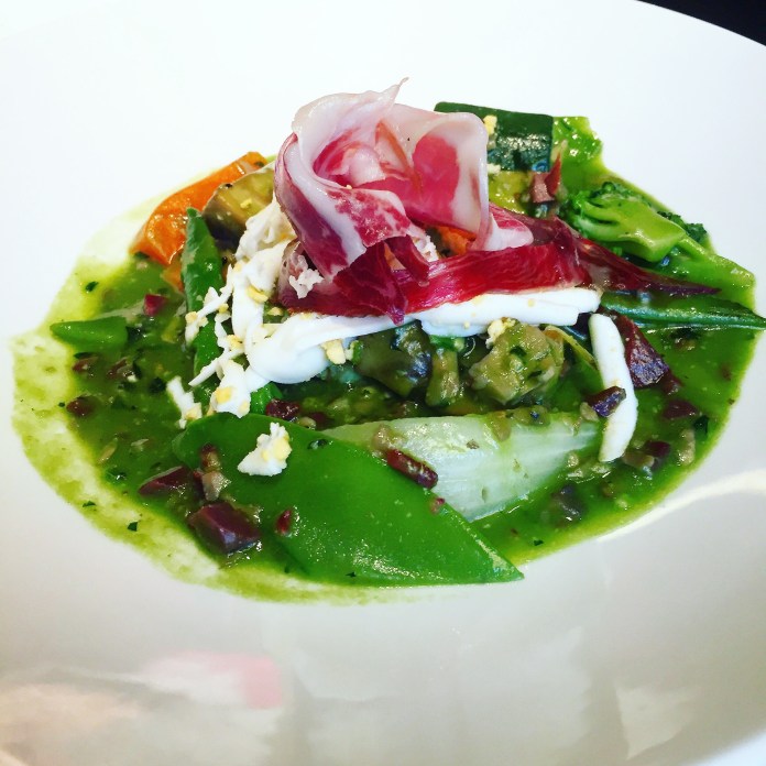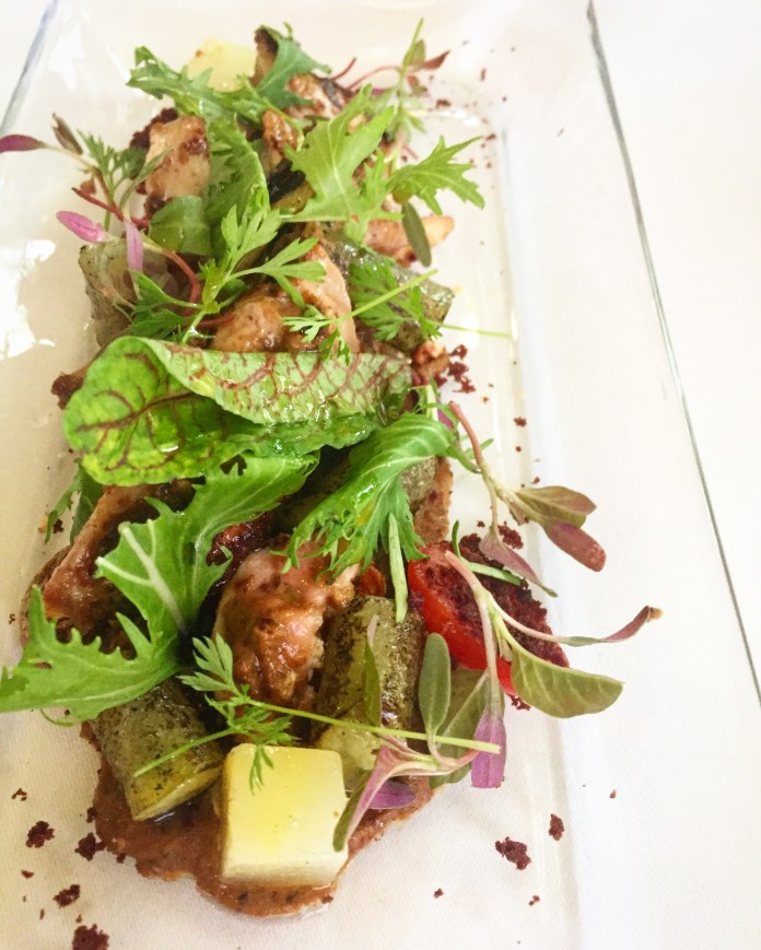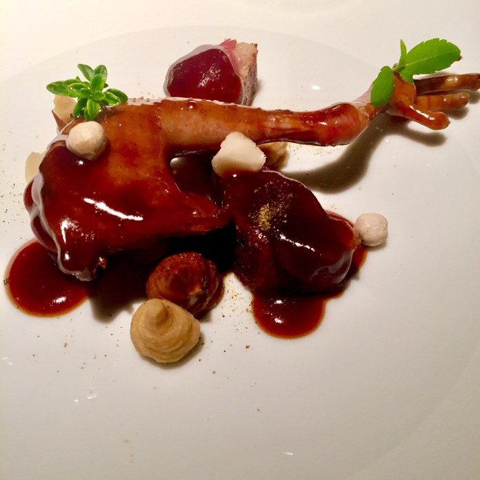 La codorniz es la vuelta a la sencillez, casi a la banalidad, porque se trata de una sabrosa pero en exceso simple ensalada de hojas verdes, chayote, café, aceitunas y avellanas. Y codorniz, por supuesto.