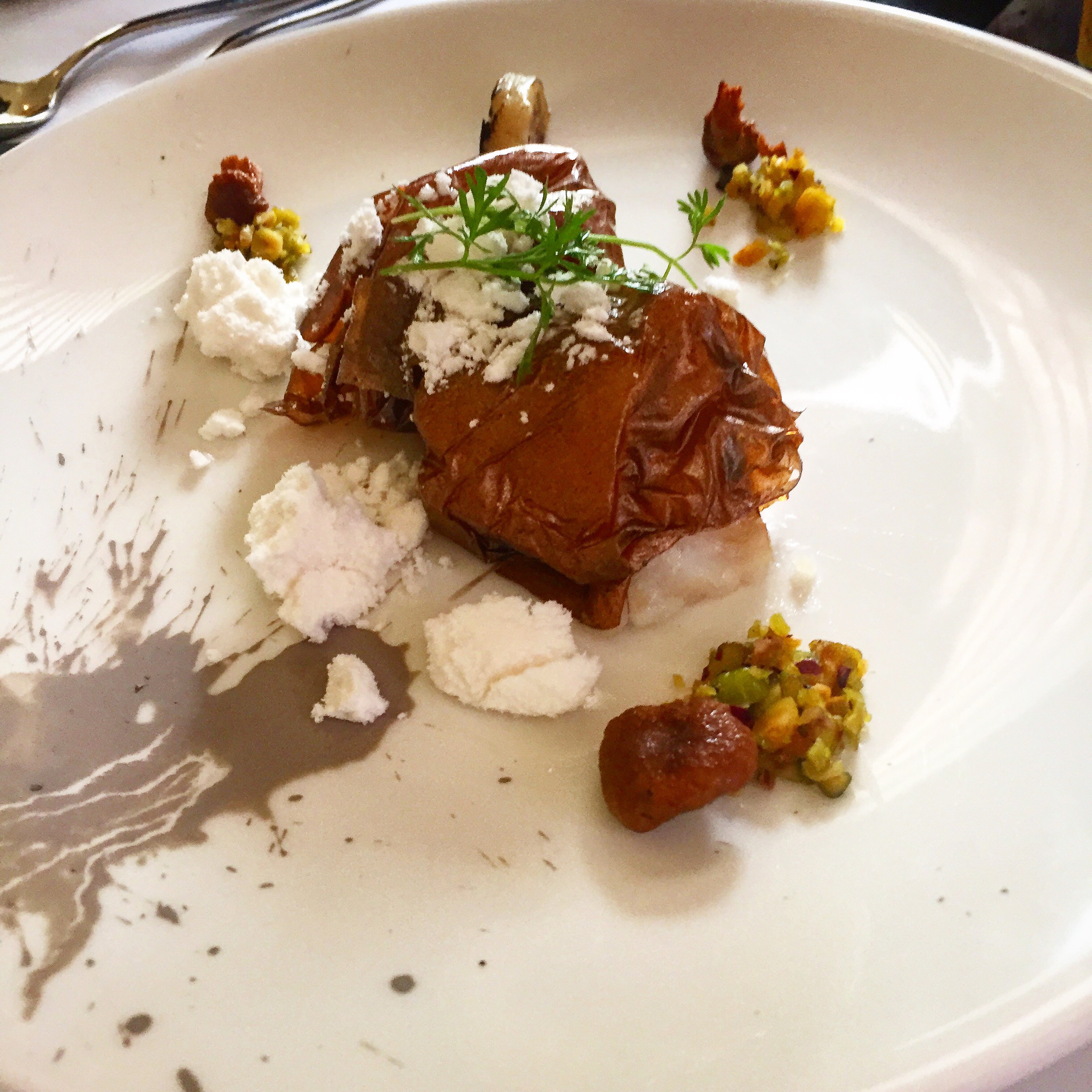 La pesca que es como llaman por aquí al pescado del día era huachinango, si nadie me corrige el pescado más consumido en México y aún así será poco, porque aquí tampoco se matan por los peces. Mejora mucho las recetas tradicionales mexicanas al estar confitado y mezclarse con pistachos, guindilla y sardina. La salsa de hongos le da un toque campestre al plato, sumamente original y adecuado.