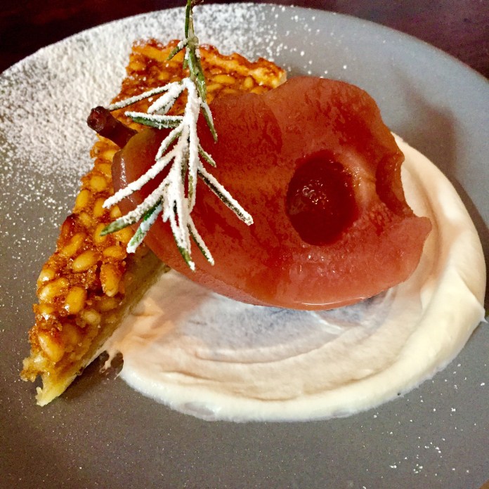 Una insípida perca se rellena sabiamente de huevas de trucha y está colocada sobre una deliciosa lámina de apio y puré de ortiga. Es un plato bello y que mezcla maravillosamente tierra y agua, pero la que atraviesa los campos en forma de río, la más cercana y generalmente, más apacible.