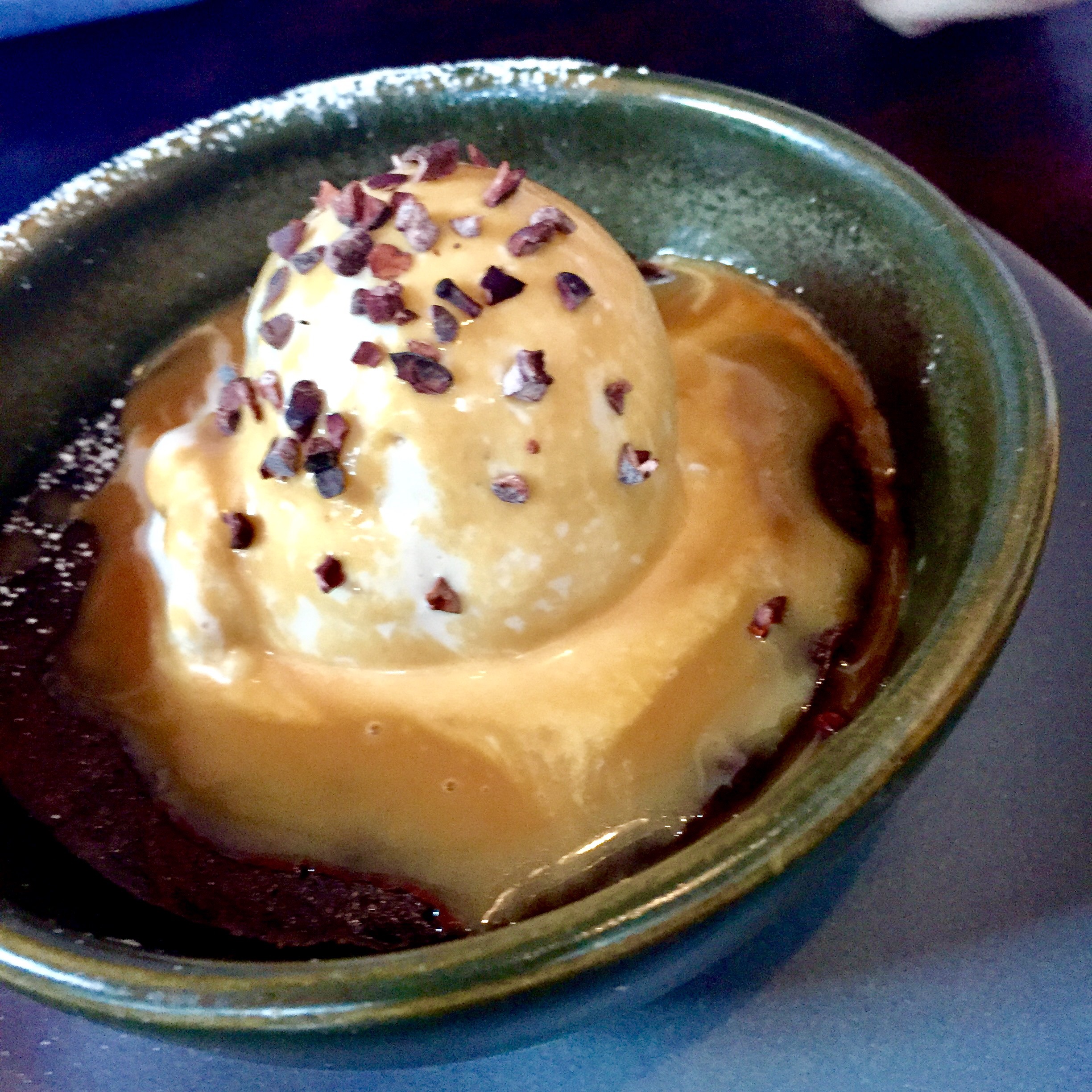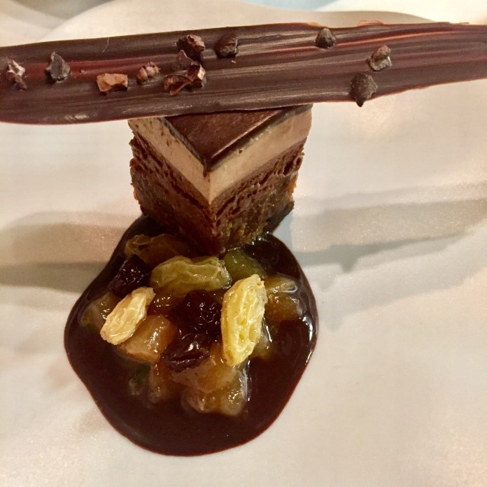 Para acabar un gran chocolate que es un clásico de los bombones -y las tabletas-, aquí deconstruido. Crujiente de chocolate, pastel de tres chocolates, salsa de chocolate negro y pasas embebidas en alcohol. Una mezcla segura y fantásticamente ejecutada.