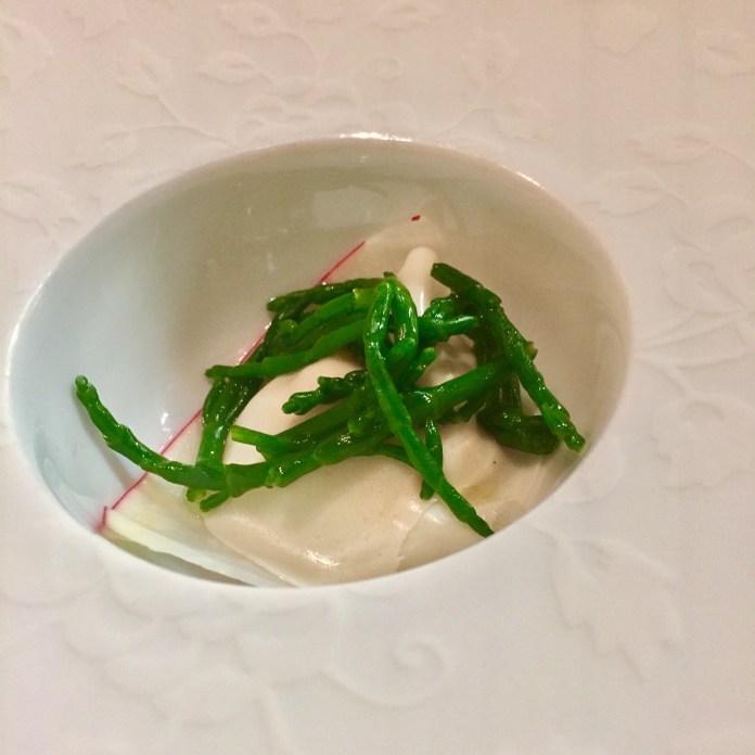 En Pierre Gagnaire, apenas nos sentamos en la mesa, esta se cubre de un verdadero festival de aperitivos, mantequilla al limón (un sinsentido) y clásica (una maravilla), palitos de colores, una miniensalada de gambas grises y muchas otras exquisiteces
