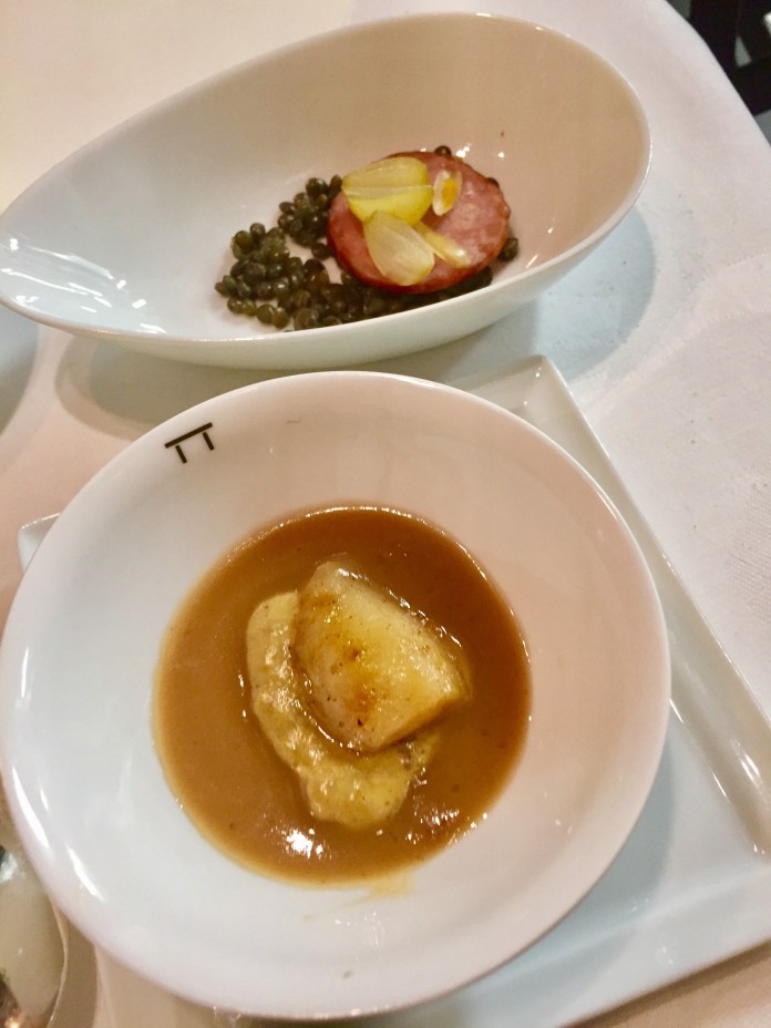 Los otros acompañamientos se colocan en pequeños platillos, como antes hacía -y espero que cuando la receta lo pida, lo vuelva a hacer- Ramón Freixa. Aquí son un buen flan de chucrut, mucho más suave y delicado que el repollo fermentado así a secas y una rodaja de salchicha de Morteau con unas diminutas y aterciopeladas lentejas verdes y toques de cebolla muy crujiente.