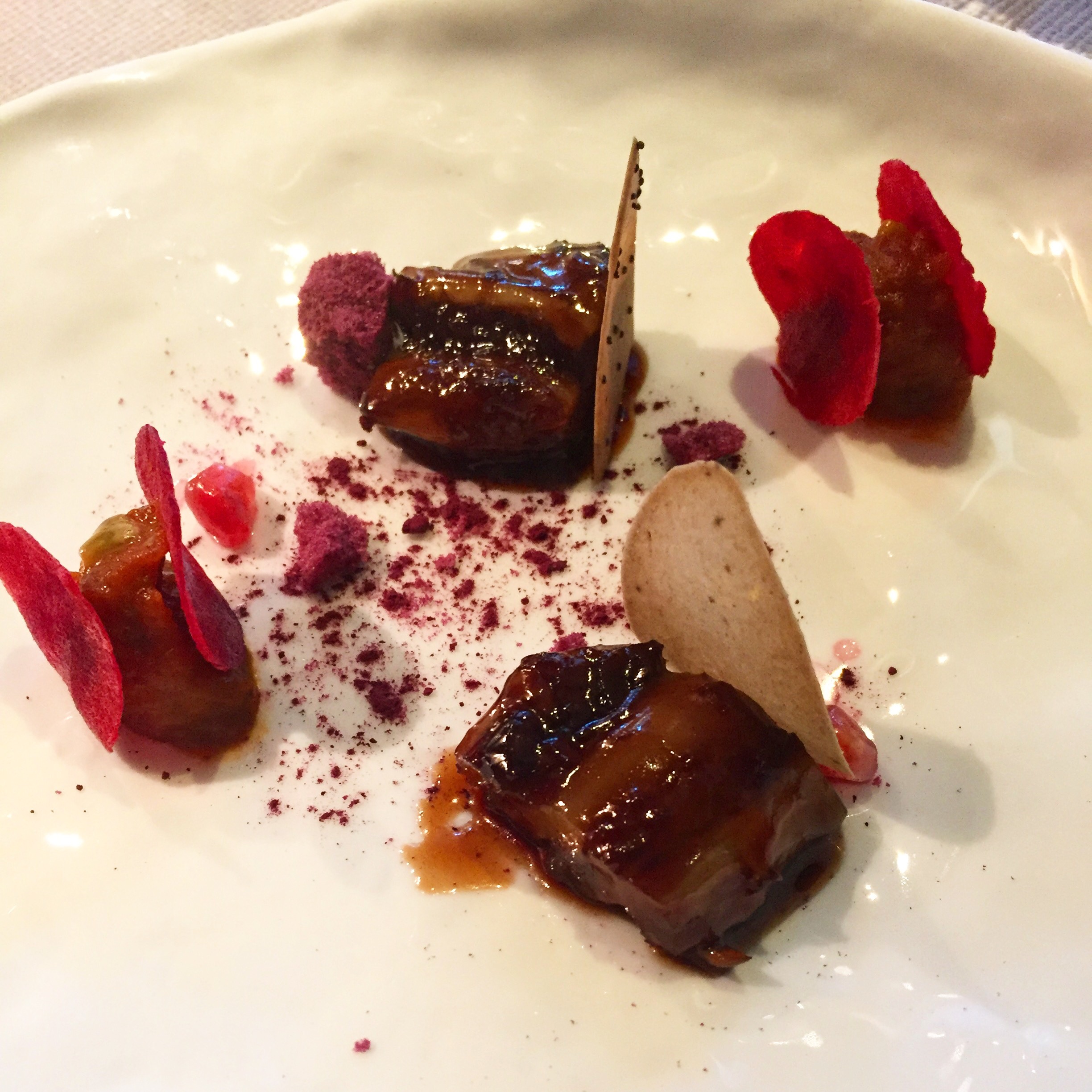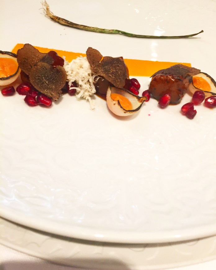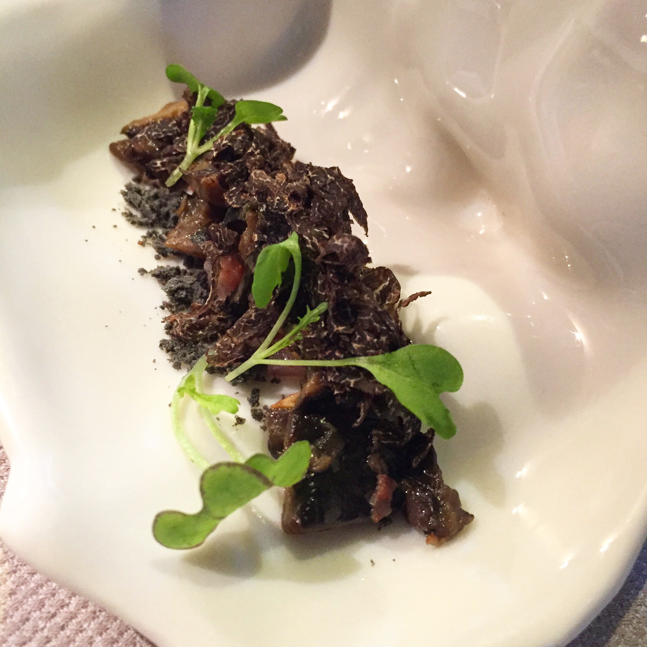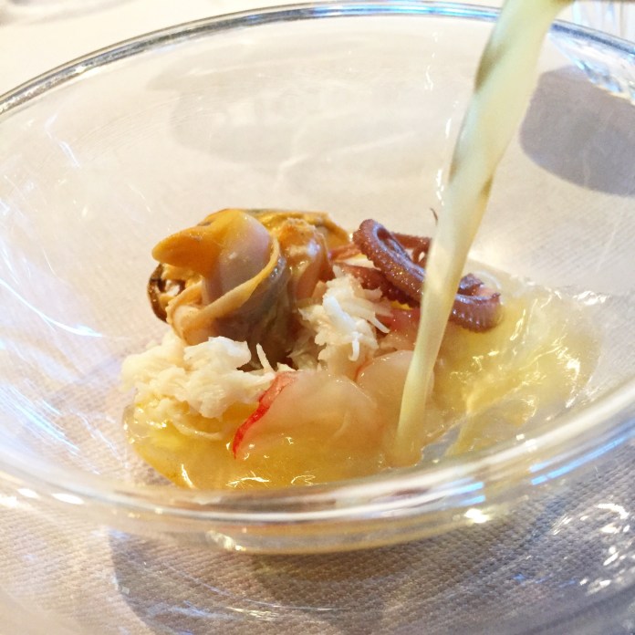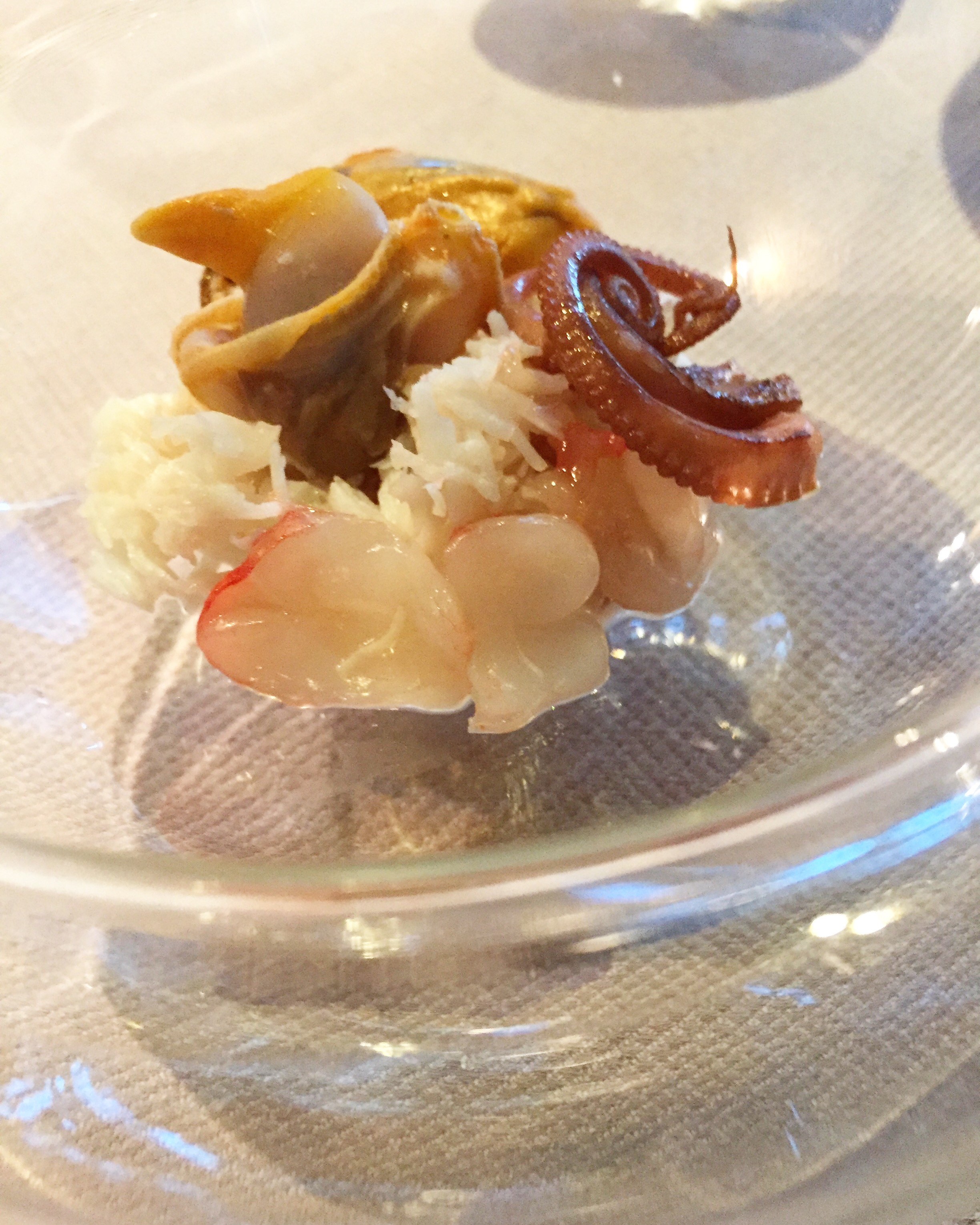 Y hablando de nombres de platos…: Sobre unas hojas de acelga: umami, alcachofas, bogavante y trufas. La vainilla que quiere ser trufa. El resultado es magnífico. Me encantan las alccachofas, me gusta mucho el bogavante y me apasionan las trufas, así que tenía que enamorarme. Tampoco es raro porque todos son grandes ingredientes y combinan muy bien. La vainilla que quería ser es un clásico en Ramón. Algo que es y no es al mismo tiempo. Aquí la vaina de la vainilla es crema y trufa también. No conseguí alcanzar el umami (el quinto sabor de los japoneses) pero no pasa nada. Tampoco entiendo en absoluto el sintoísmo.