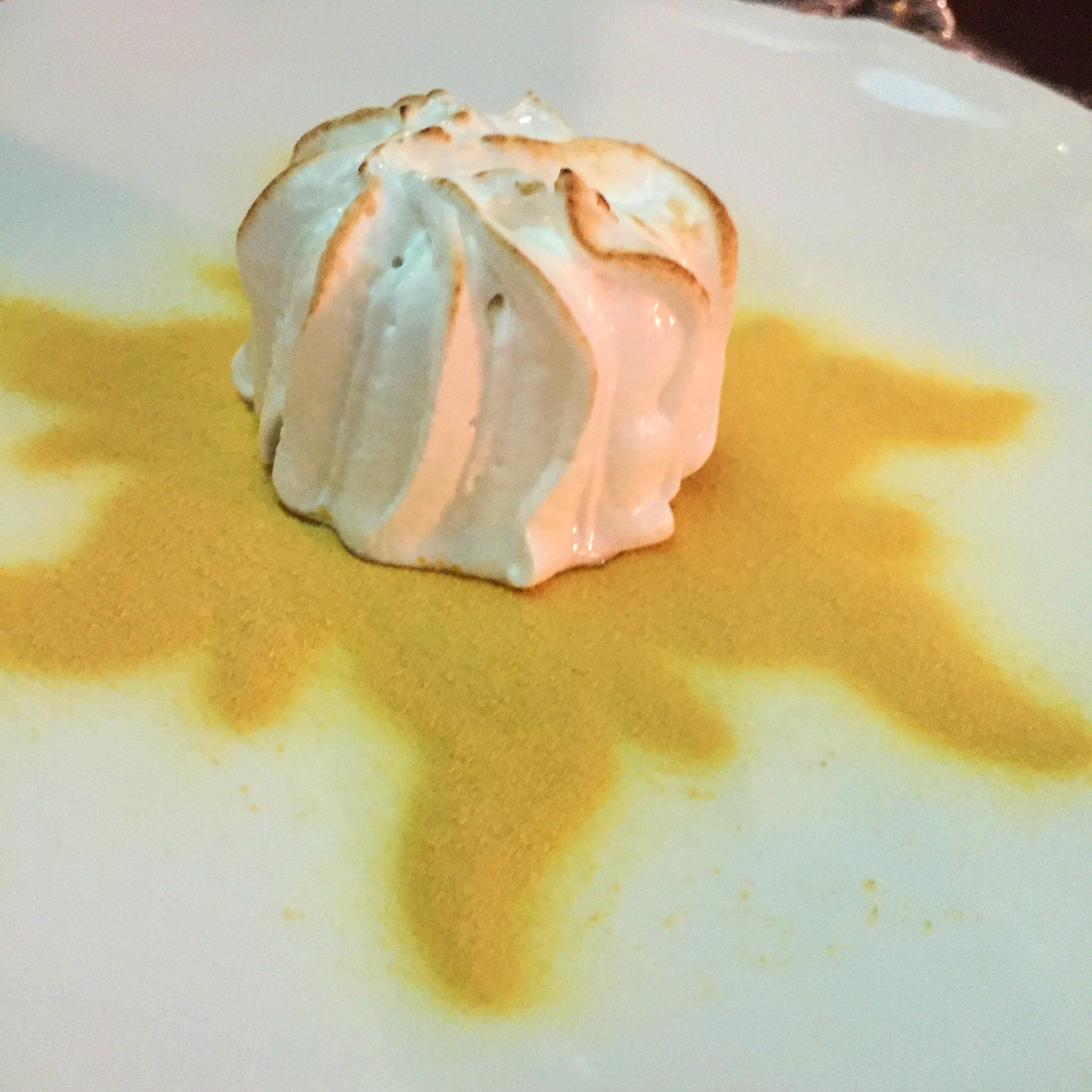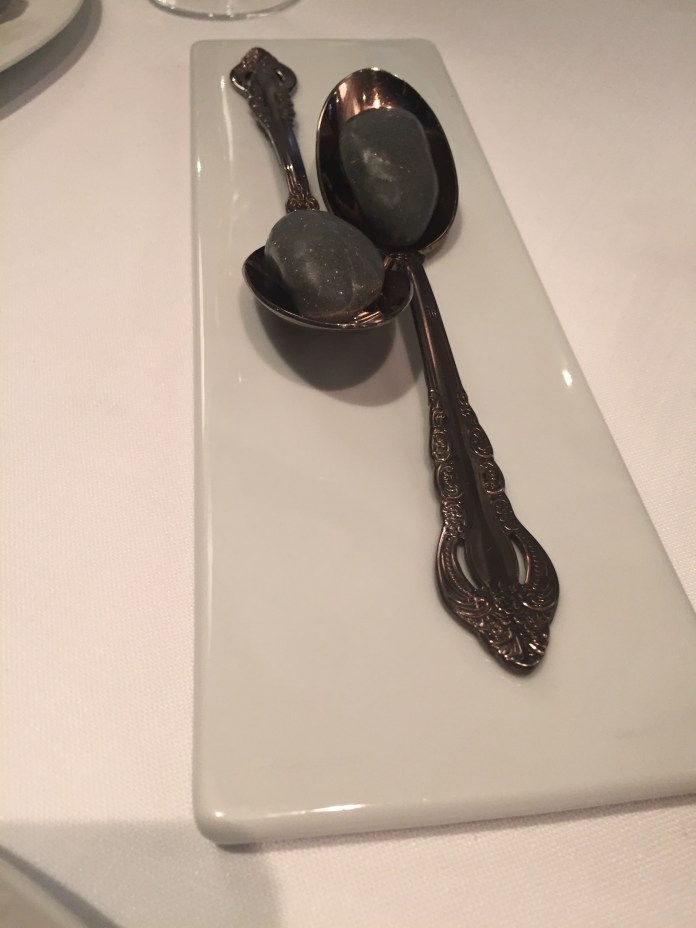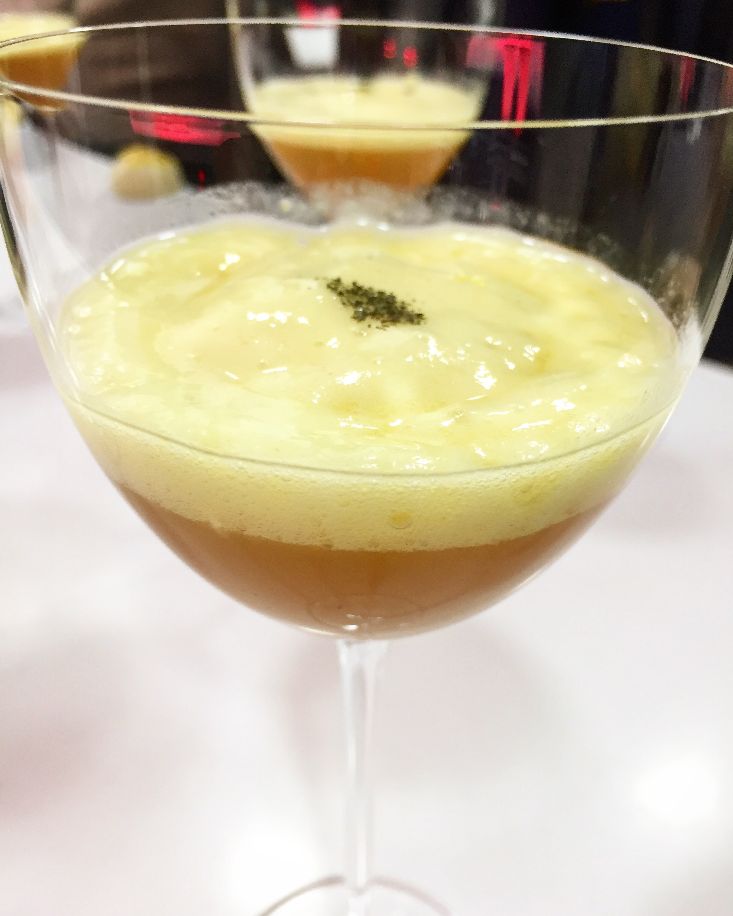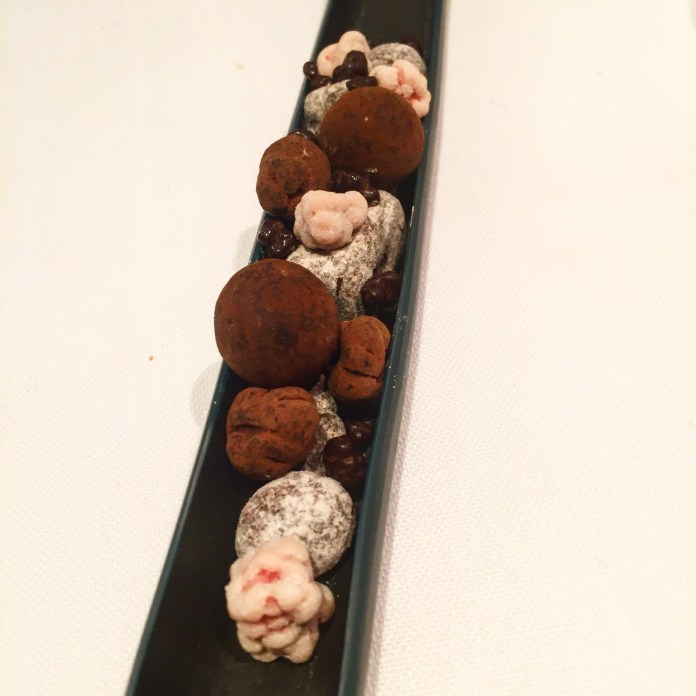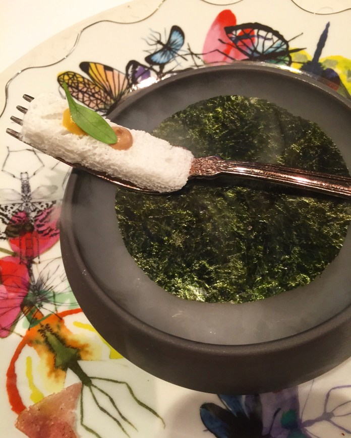 Y hablando de nombres de platos…: Sobre unas hojas de acelga: umami, alcachofas, bogavante y trufas. La vainilla que quiere ser trufa. El resultado es magnífico. Me encantan las alccachofas, me gusta mucho el bogavante y me apasionan las trufas, así que tenía que enamorarme. Tampoco es raro porque todos son grandes ingredientes y combinan muy bien. La vainilla que quería ser es un clásico en Ramón. Algo que es y no es al mismo tiempo. Aquí la vaina de la vainilla es crema y trufa también. No conseguí alcanzar el umami (el quinto sabor de los japoneses) pero no pasa nada. Tampoco entiendo en absoluto el sintoísmo.