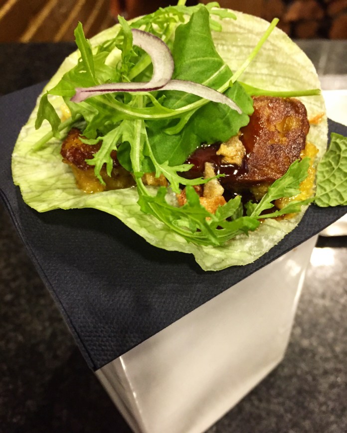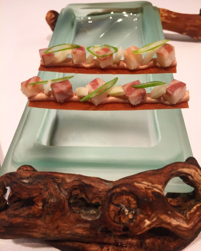 La cruji coca de foie, anguila y manzana es un elegante canapé que sobre una hojaldrada y crepitante base mezcla esos tres ingredientes de mezcla perfecta que Berasategui mezcló con audacia y ahora son un clásico.