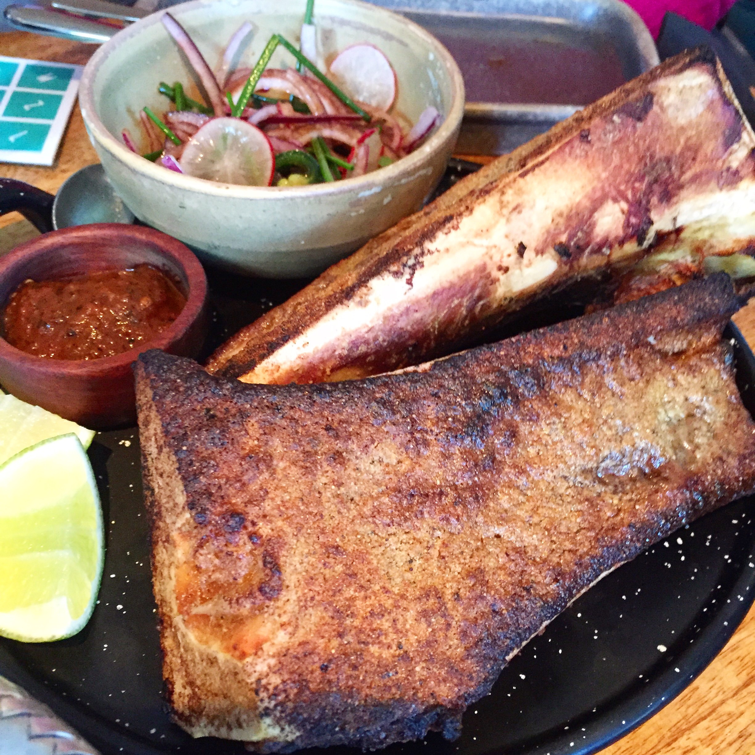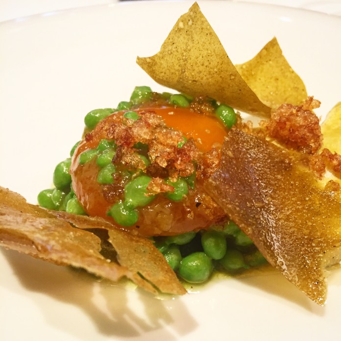 A mí que soy tan crítico con los obvios nombres de los platos modernos me gusta el de este: lo mejor de la cabeza de la merluza con guisantes, corazón de lechuga, yema curada y pil pil de pimientos verdes. Lo mejor -salvo para cantoneses y otros a quienes les encantan los ojos, puaj…- es evidentemente la cococha. Su toque graso, como el de la yema o el pil pil, se contrarresta con los frescos toques de unos guisantes excepcionales y de una humilde y sabrosa lechuga. Un plato de pescado y vegetales absolutamente perfecto.