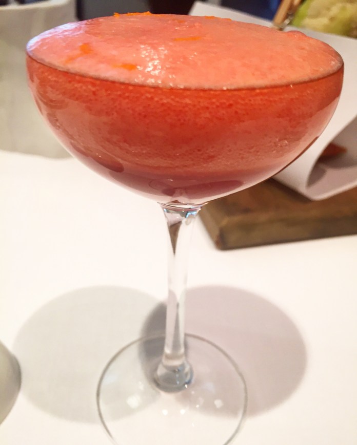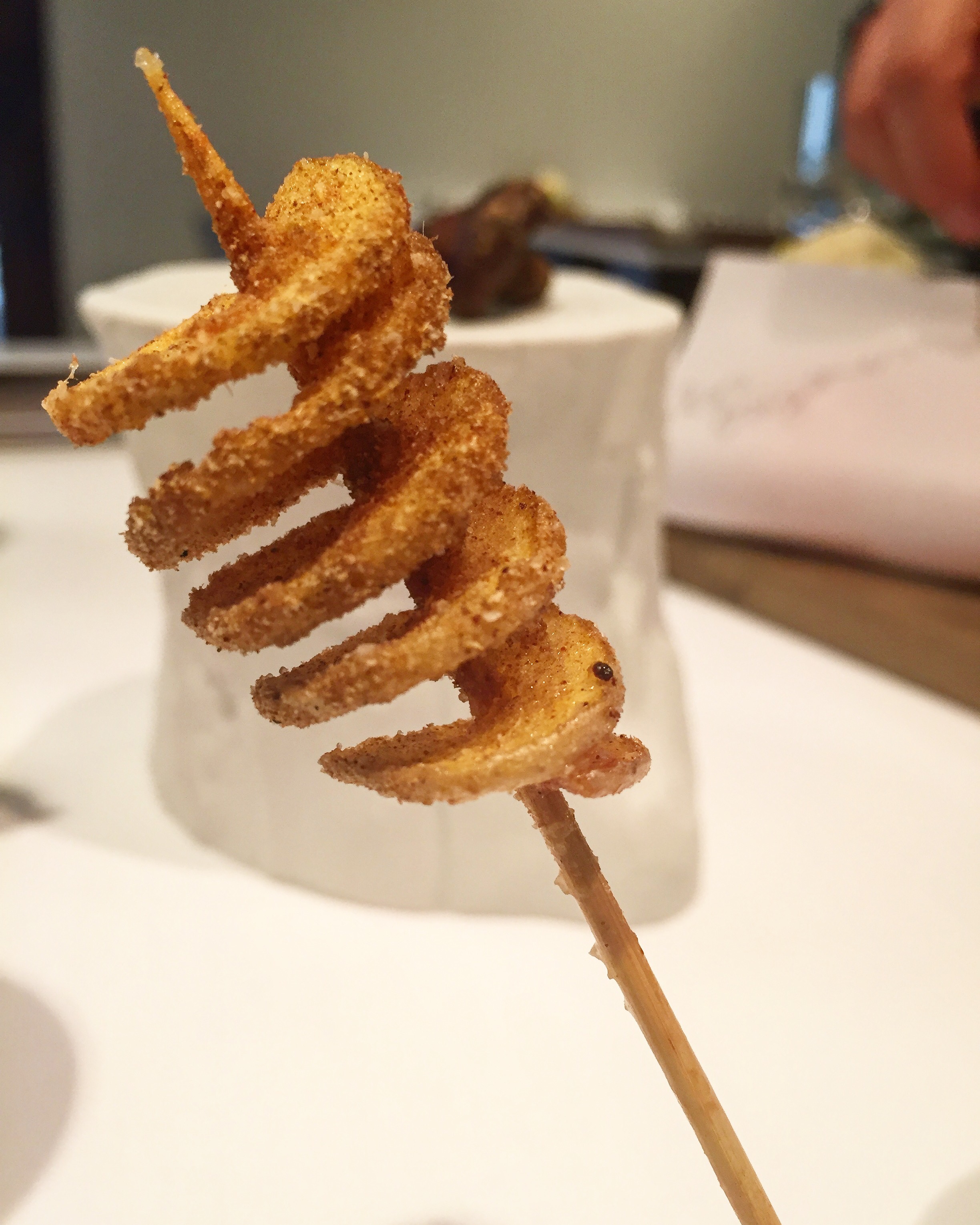 El excelente y opulento menú de invierno comienza con un original negroni a la valenciana, acompañado de una bella y virtuosa espiral de patata que tiene el original y delicioso aroma del anís estrellado; un chip take que es como un aéreo buñuelo de setas y su irrenunciable pan con tomate y salchichón de Vic, en el que el pan es una finísima y crujiente lámina que se deshace en la boca junto con un finísimo salchichón. Ya se empieza sin respiración porque todo es tradición renovada y modernidad discreta, alarde de técnica y soluciones audaces.