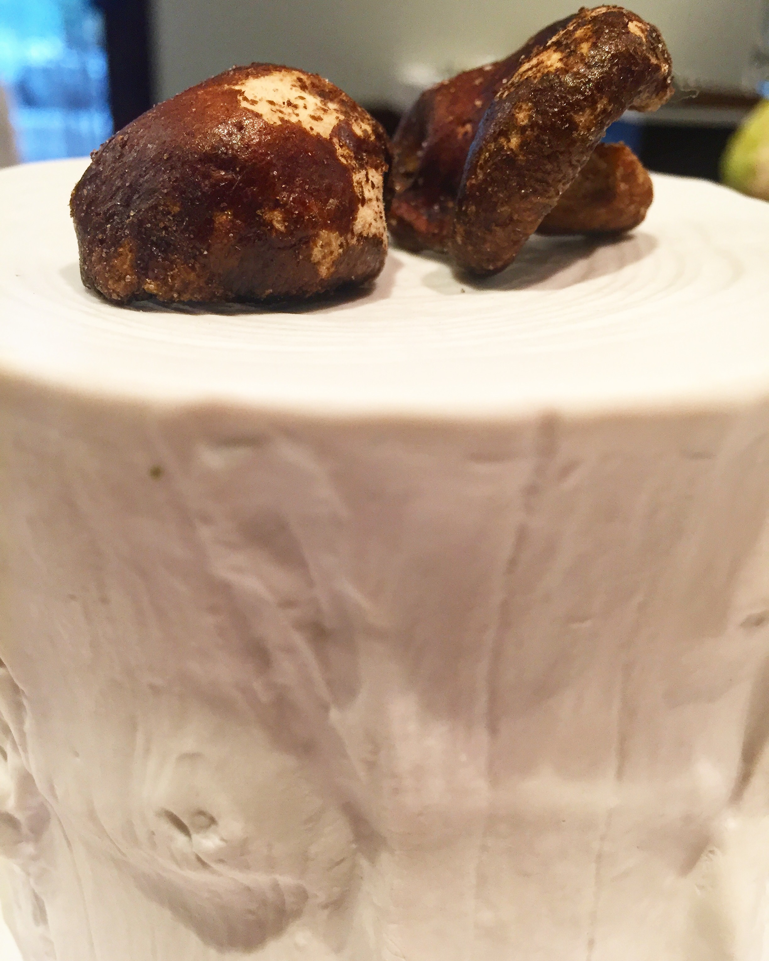 La piedra mimética de piñón de pino sea de queso, como al principio, sea de piñón como ahora es otro clásico. Parece auténtica piedra pero es un estallido de piñones en la boca. Hay que comerla entera porque bajo el crujiente envoltorio posee un alma líquida. El aire frío de coco thai nos lleva de lo líquido a lo escarchado en un pequeño bocado que es todo coco y especias tailandesas condensadas en tan minúscula porción. Lo que se percibe es mucho más que lo que cabría esperar.