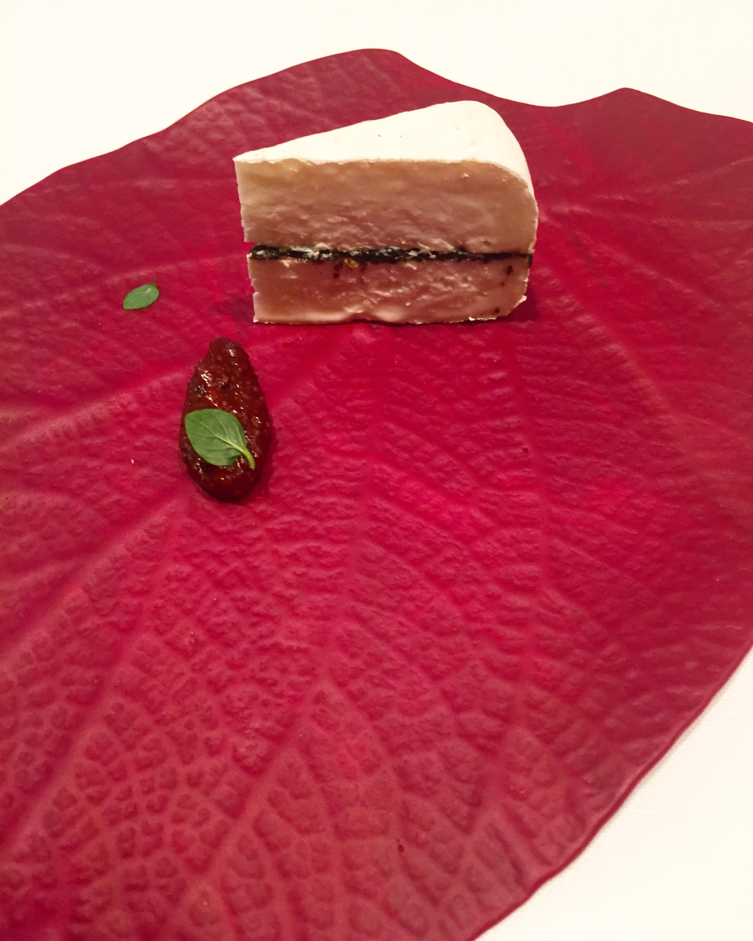 Era difícil seguir tras los placeres liebrescos -que no librescos- pero consiguió sorprenderme y deleitarme con el queso porque no es un queso, es una performance, una intervención. El laminado de portobello con binomio de queso Puigpedros y Gutizia, microchampiñones y mustarda de aceitunas es el resultado de mezclar día quesos, rellenarlos a su modo y hacer otro completamente distinto. El producto de tanta osadía, excelente.