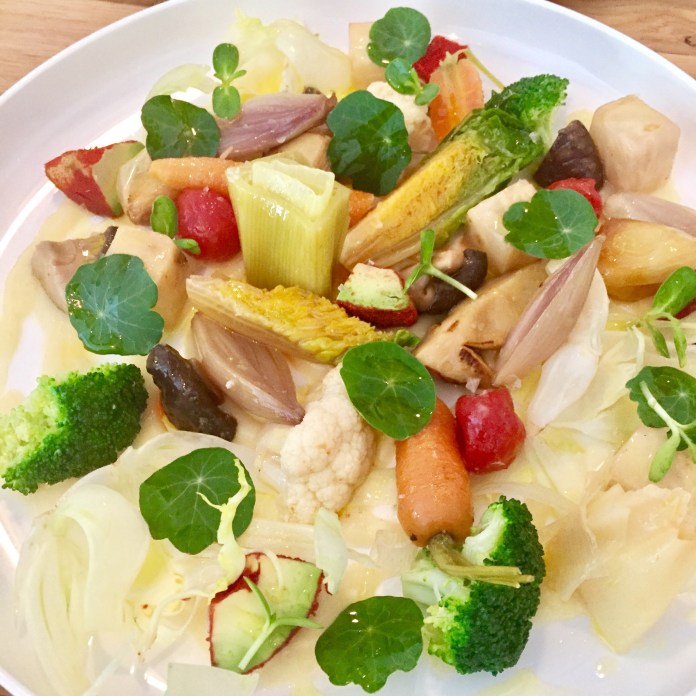 El primer plato consiste en una frutal ensalada de pato crujiente y chalotas que agrega pamplinas, brotes varios y pomelo tanto rosa como amarillo. Se mezcla en la misma mesa llenándose de sabores.