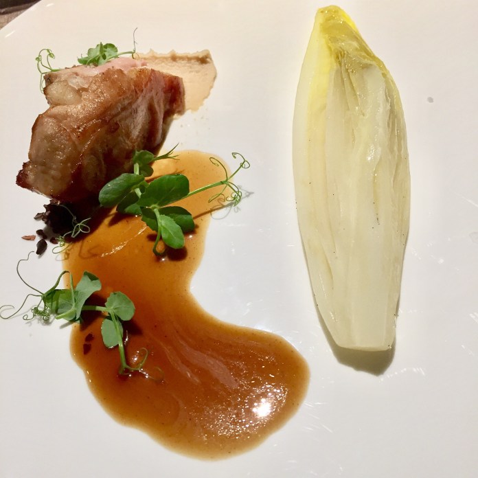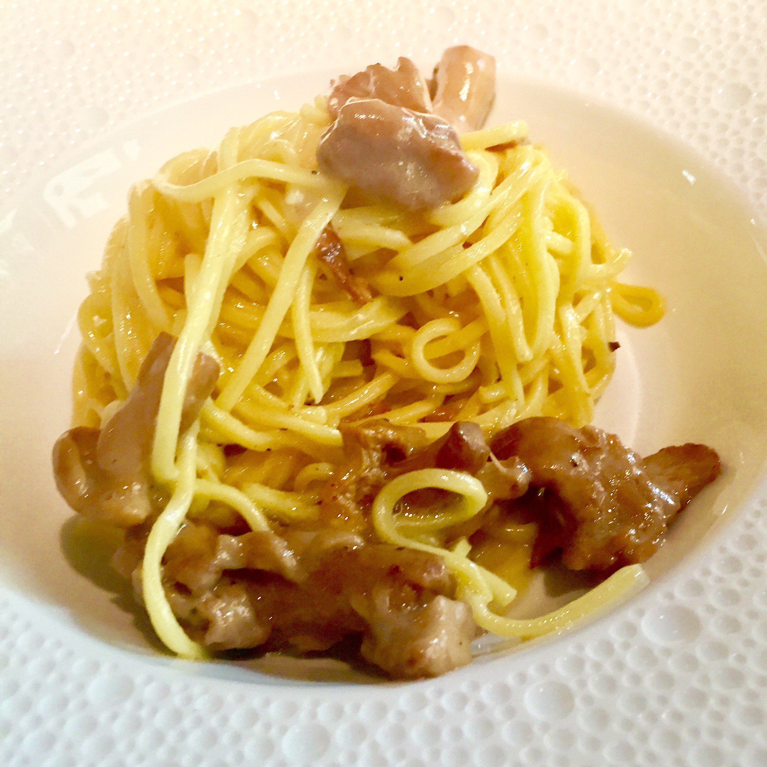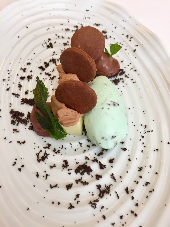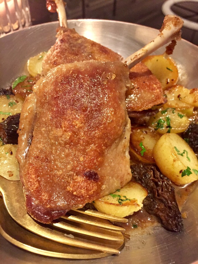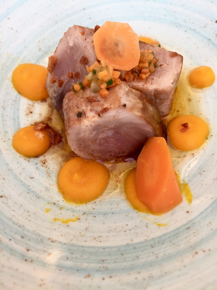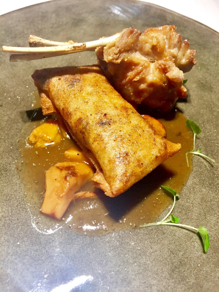 De las carnes hemos optado por el cabrito en chuletas, pastella de cabrito y chantarelas -que en español se llaman rebozuelos– salteadas. Precisamente lo que me ha llamado más la atención ha sido la inclusión del gran pastel marroquí de paloma, aunque siempre se haga de pollo… Y tenía razón porque el hojaldre era crujiente y envolvente y el relleno muy intenso, gracias a los interiores del cabrito. Una guarnición que podría ser un lujoso plato. El cabrito tierno y, de nuevo, de gran calidad.