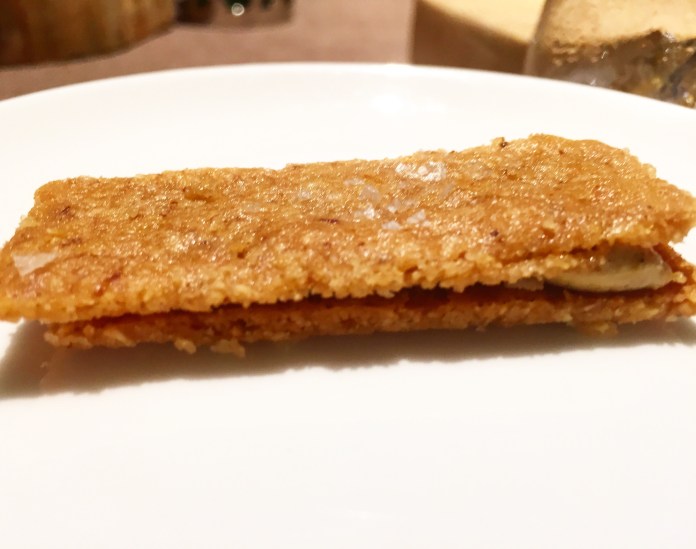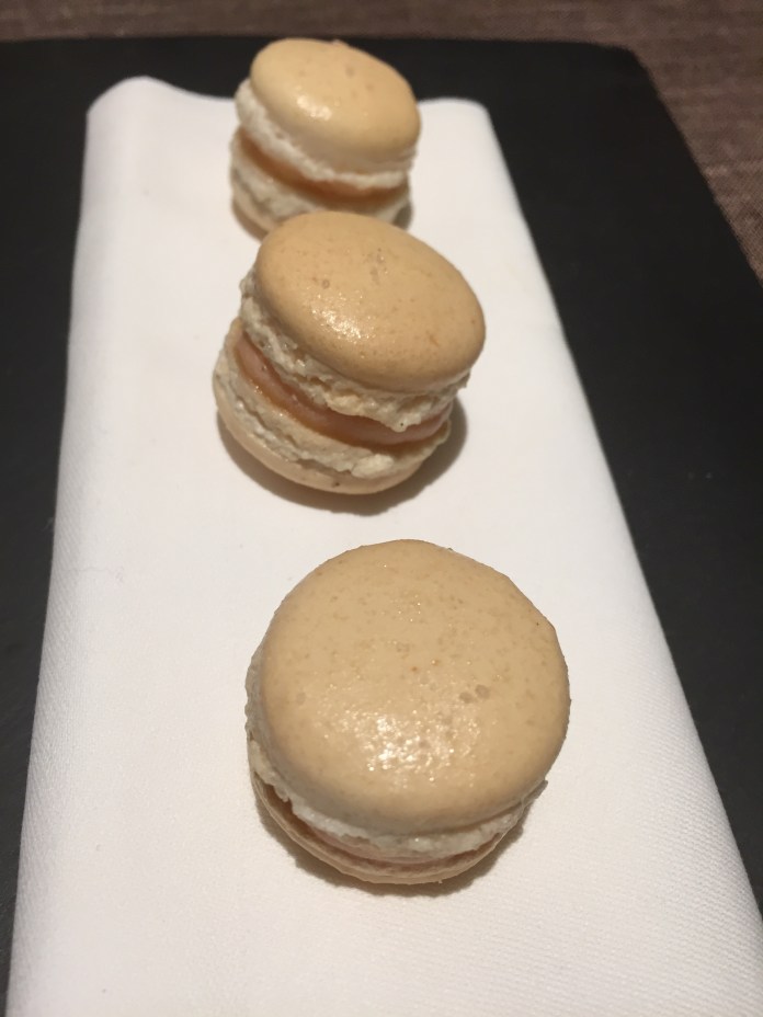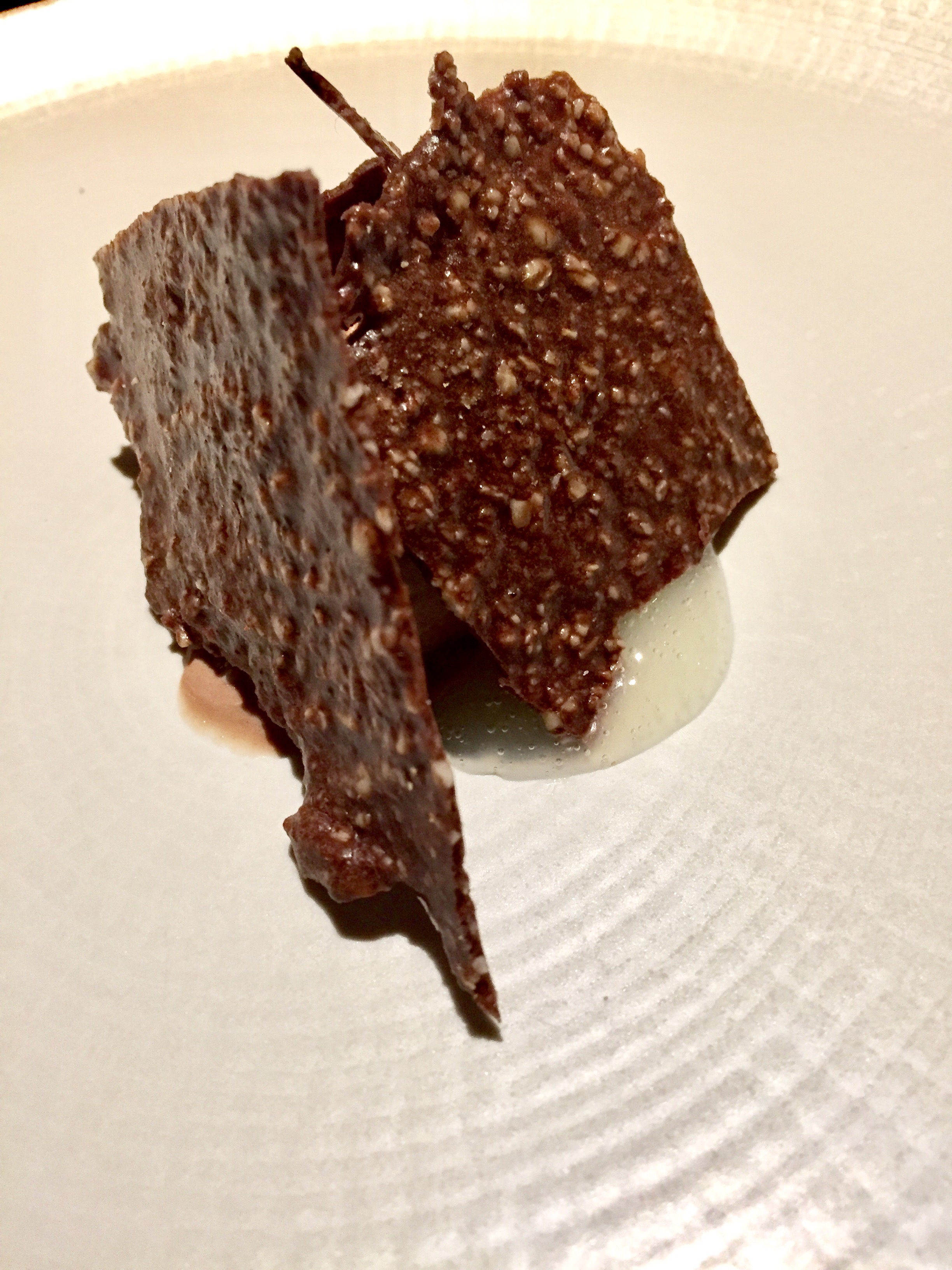 Los postres elegidos con ayuda del maitre, practican una graciosa deconstrucción de sus modelos. La tarta de limón es una buena crema de limón fría que se coloca sobre galleta desmigada y se rodea de pequeños pináculos de merengue. Todo junto es una canónica tarta de limón. Lleva un refrescante toque de galanga (o jengibre azul) y al parecer un glaseado de jengibre pero es tan tímido que yo no lo he notado.