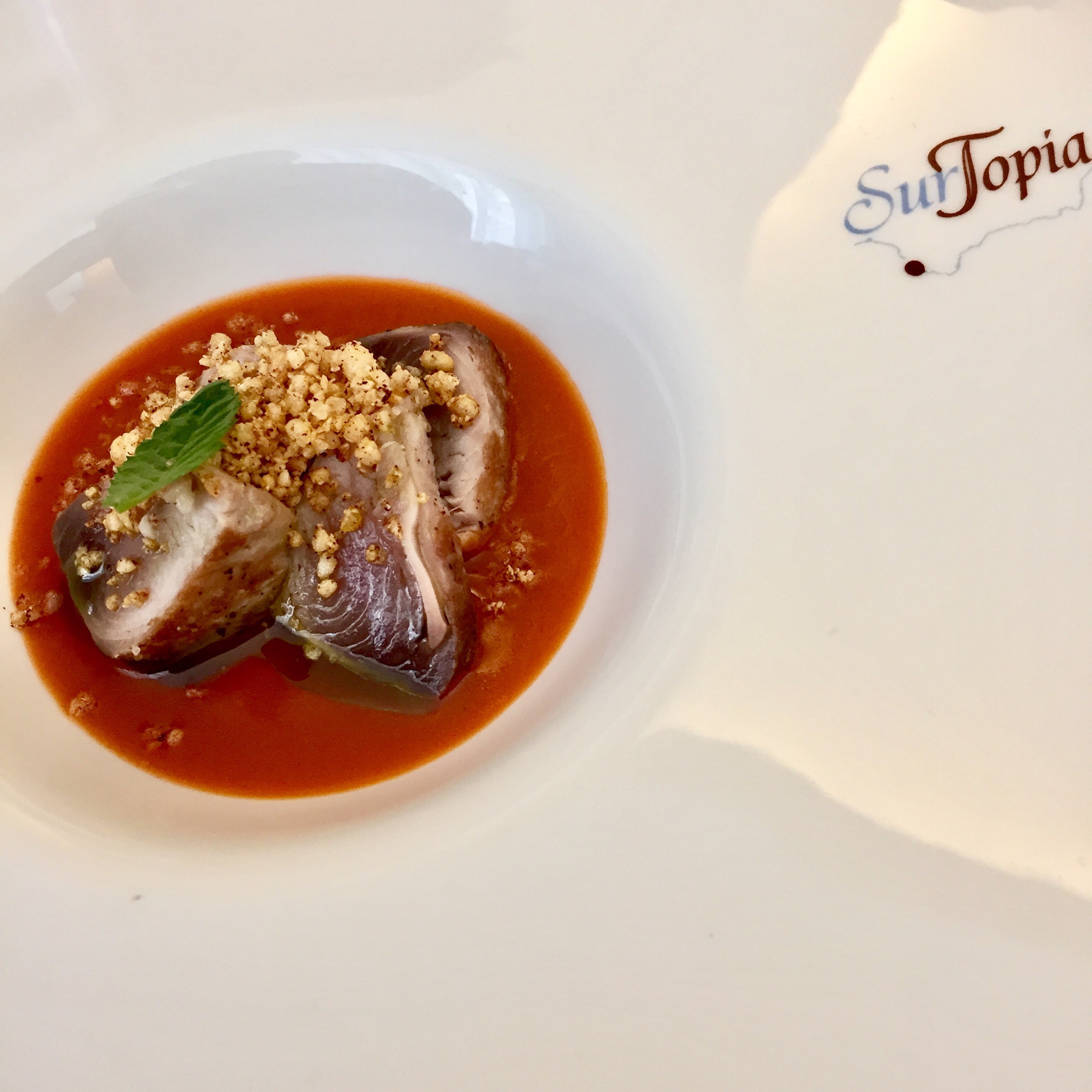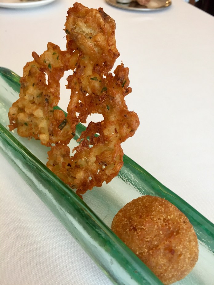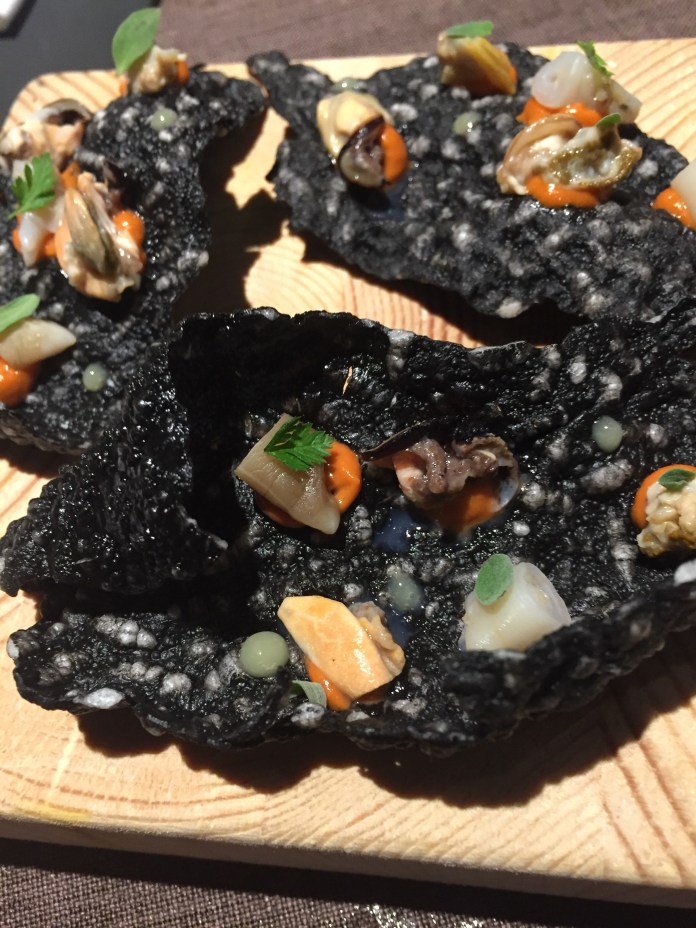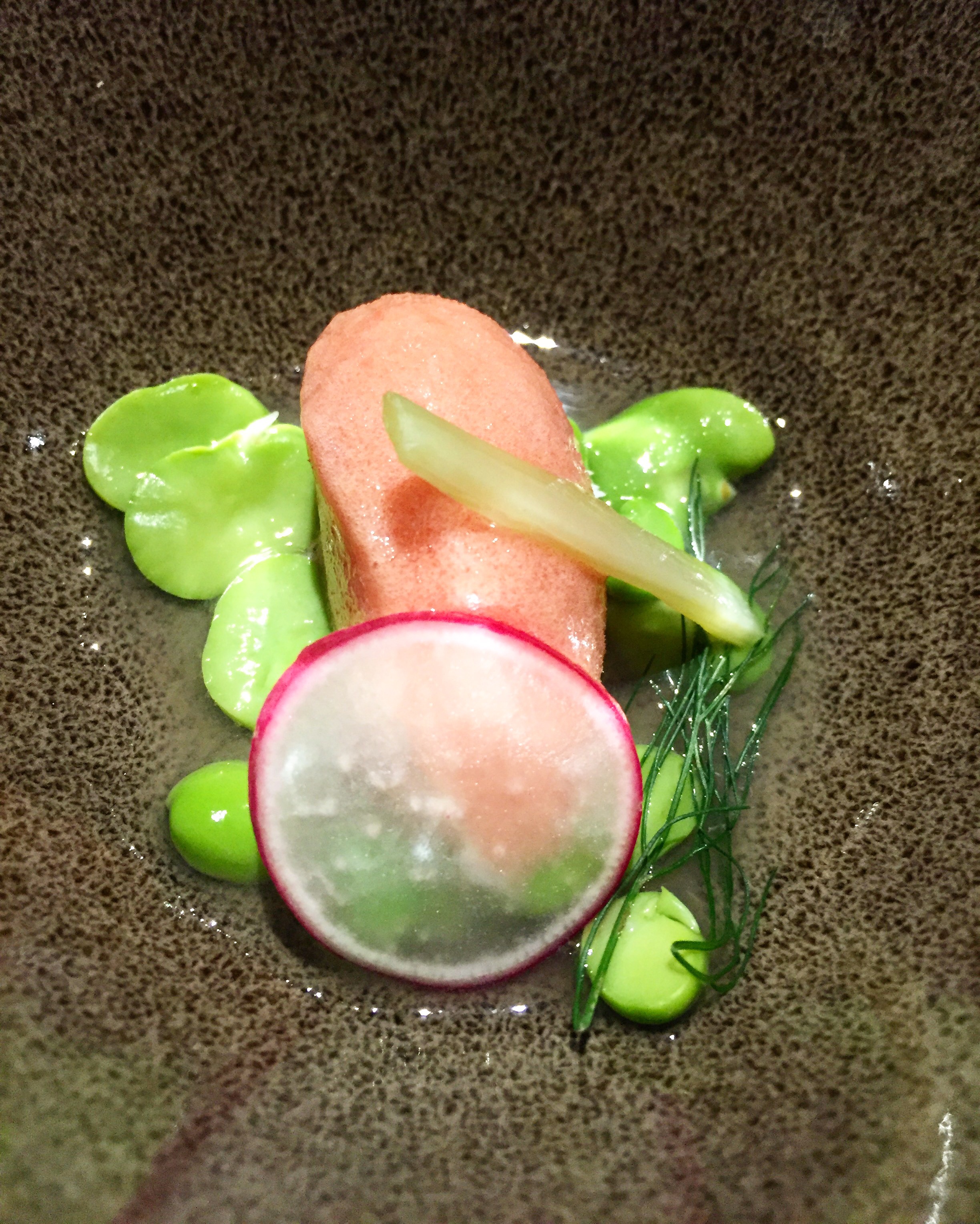 Me ha encantado nada más verlo el salpicón de fabas, berberechos, mejillones, percebes, bígaros y algas. Las aterciopeladas judías blancas combinan muy bien con esos moluscos entre los que no estaban los anunciados, humildes y sabrosos bígaros. Lo demás, buenos acompañamientos: salicornia, hojas de capuchina y unas huevas que no era tales sino perlitas de vinagre.