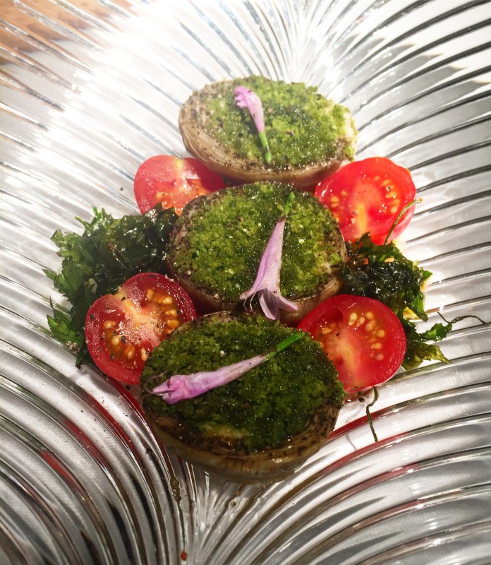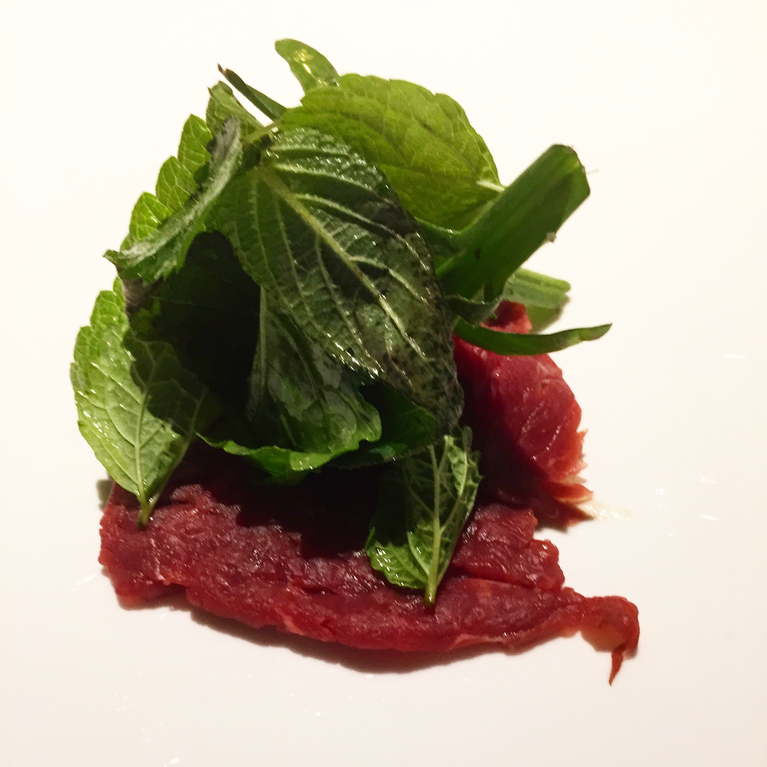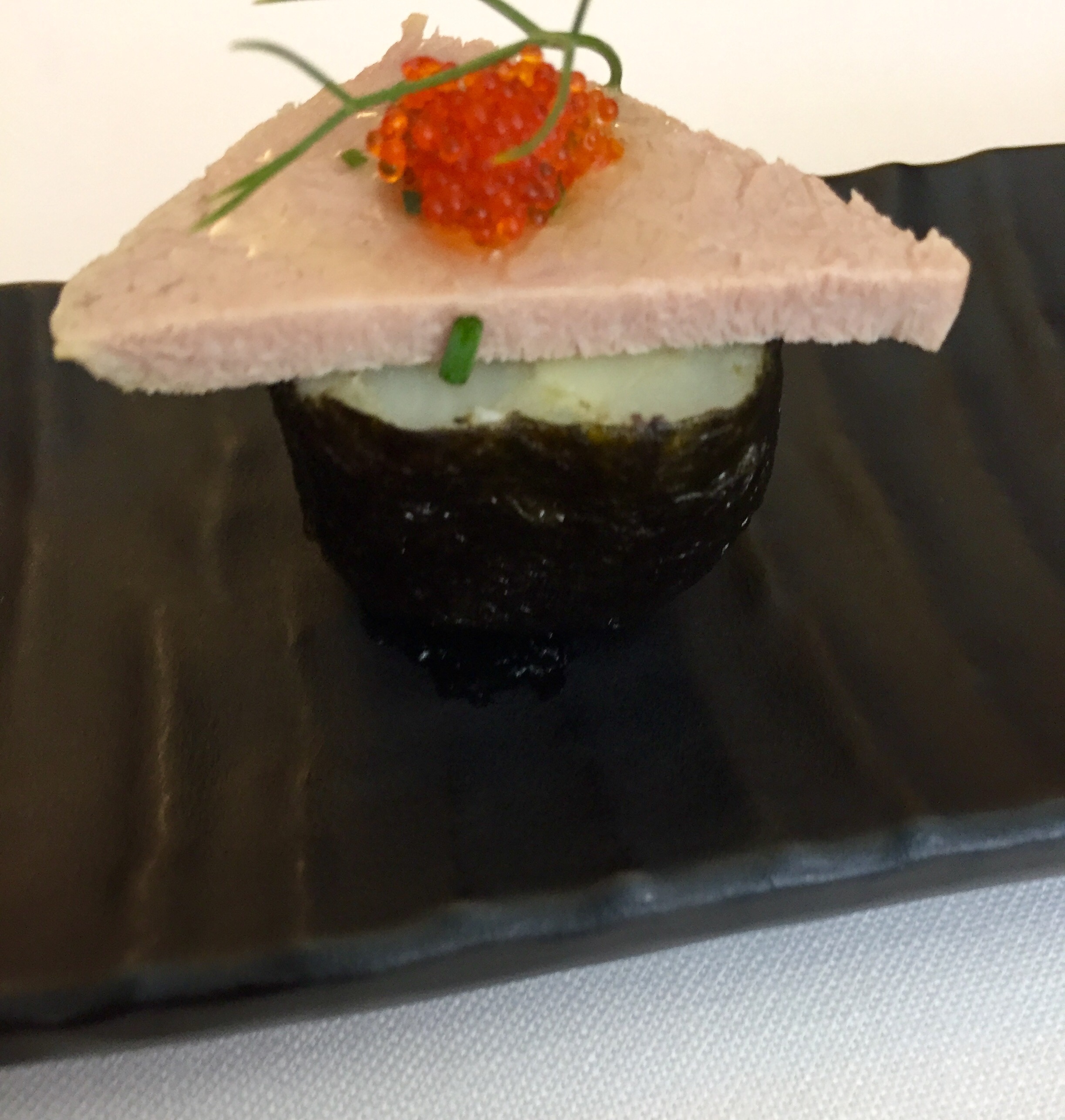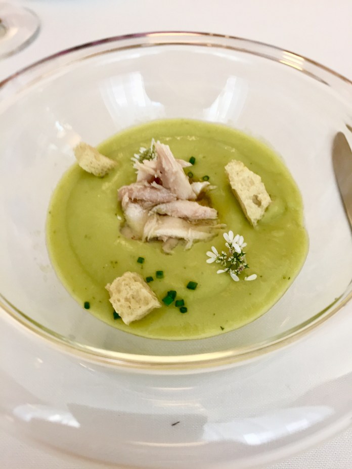 Me ha encantado nada más verlo el salpicón de fabas, berberechos, mejillones, percebes, bígaros y algas. Las aterciopeladas judías blancas combinan muy bien con esos moluscos entre los que no estaban los anunciados, humildes y sabrosos bígaros. Lo demás, buenos acompañamientos: salicornia, hojas de capuchina y unas huevas que no era tales sino perlitas de vinagre.