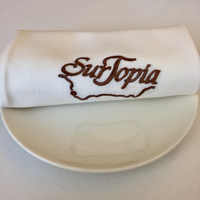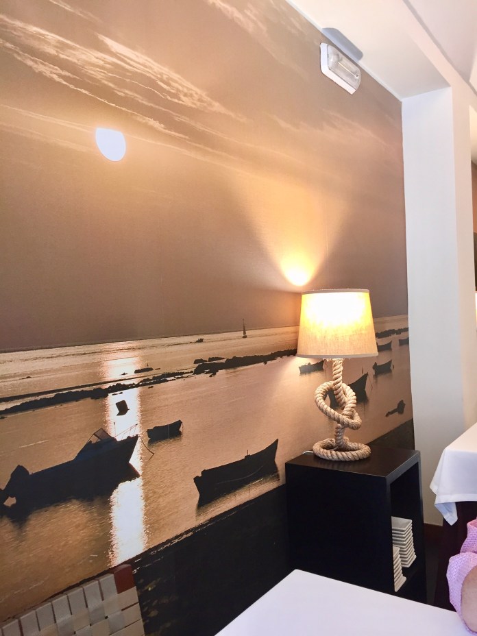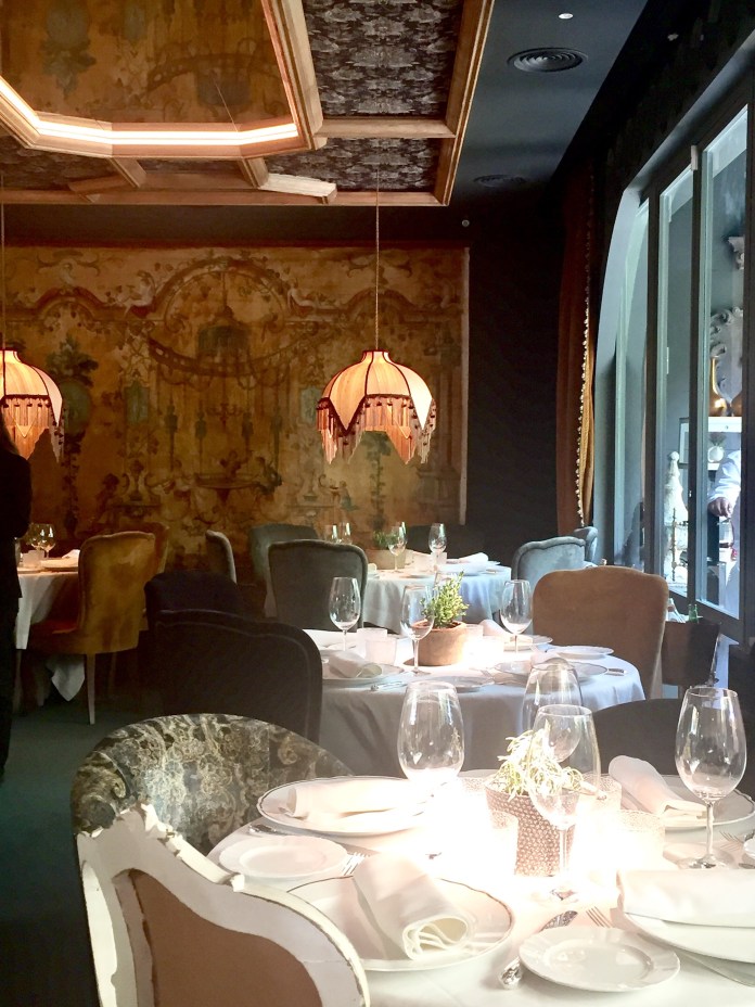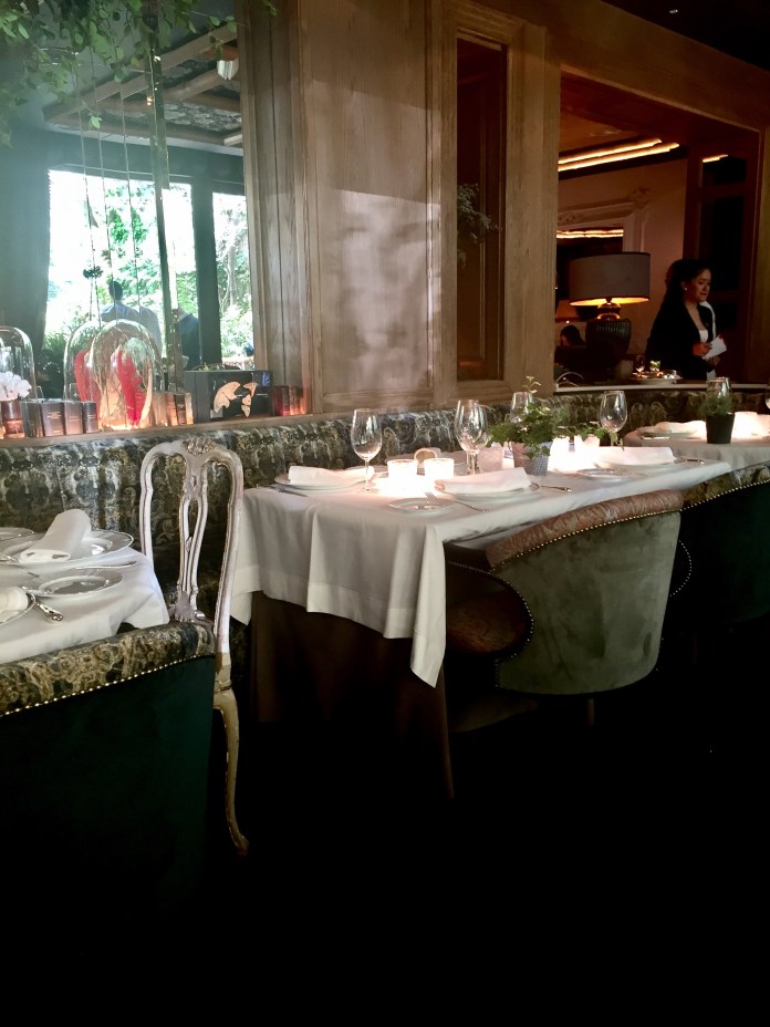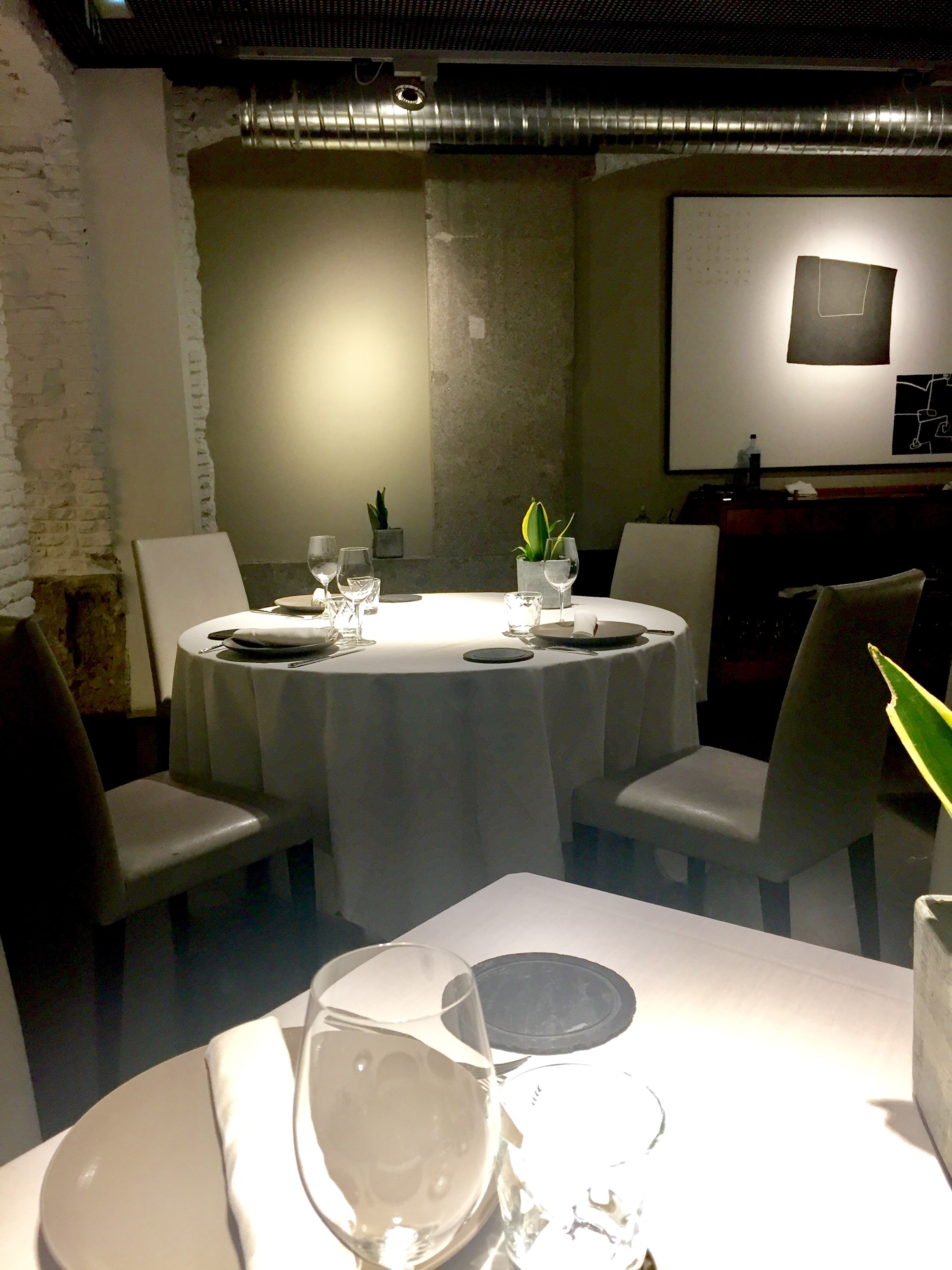 Solo he visto tres colores, gris, negro y blanco, pero multitud de texturas, ásperas en blancas paredes de ladrillo erosionado, lisas y brillanes de cristales como a punto de estallar y delicadas de suaves manteles de lino. No es un prodigio de imaginación pero nada desentona ni distrae y mejor eso que los alardes de objetos y colores que hacen de cualquier restaurante reciente una especie de Maison Decor.