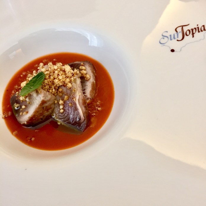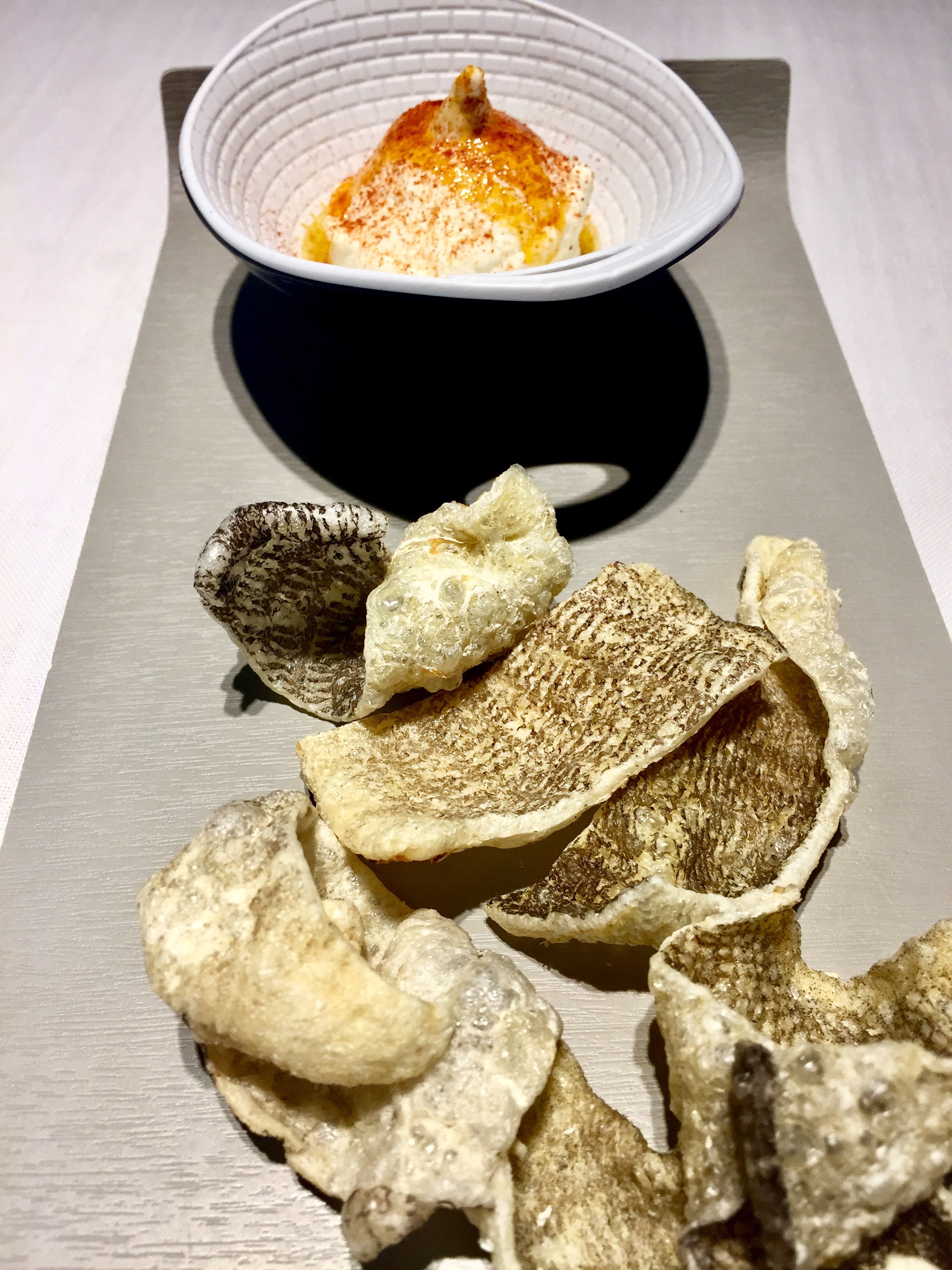 El aperitivo de la casa se rinde a la moda de las pieles de pescado convertidas en torreznos. En esta ocasión son de bacalao y se sirven con una tradicional y cremosa brandada, pero que gana enormemente con el toque punzante y levemente picante del delicioso pimentón de la Vera.