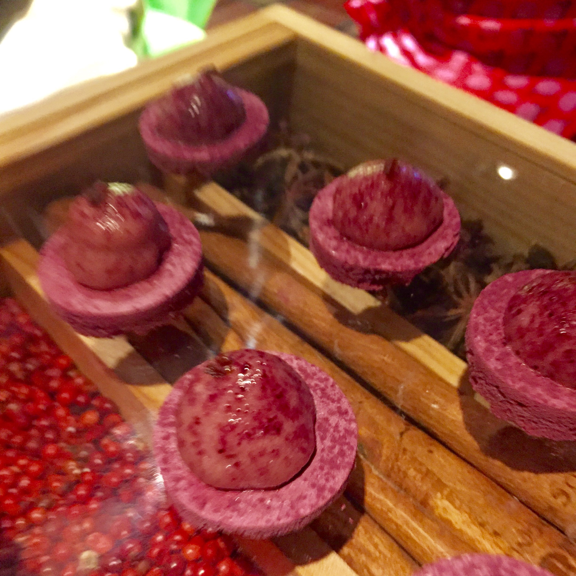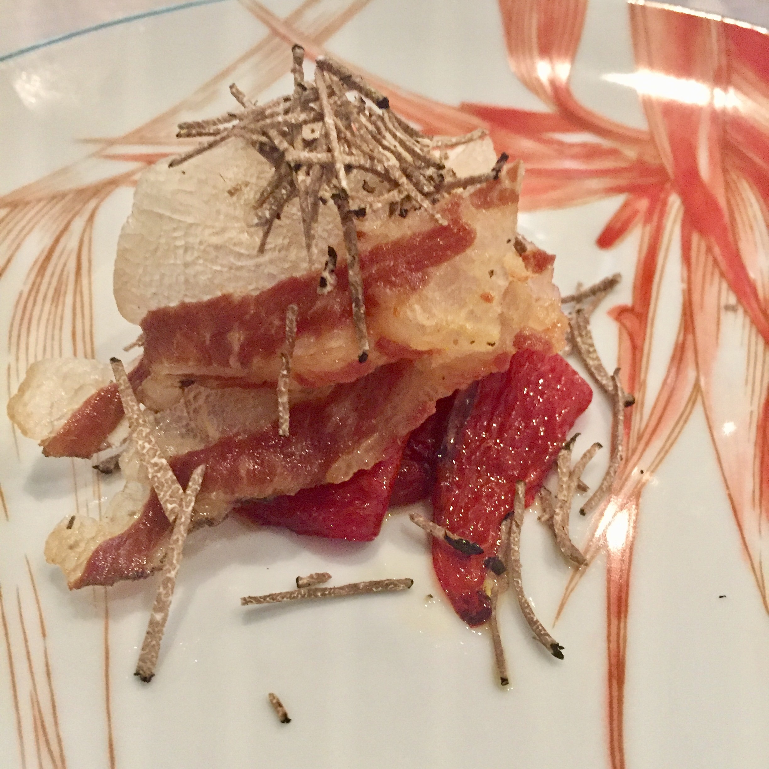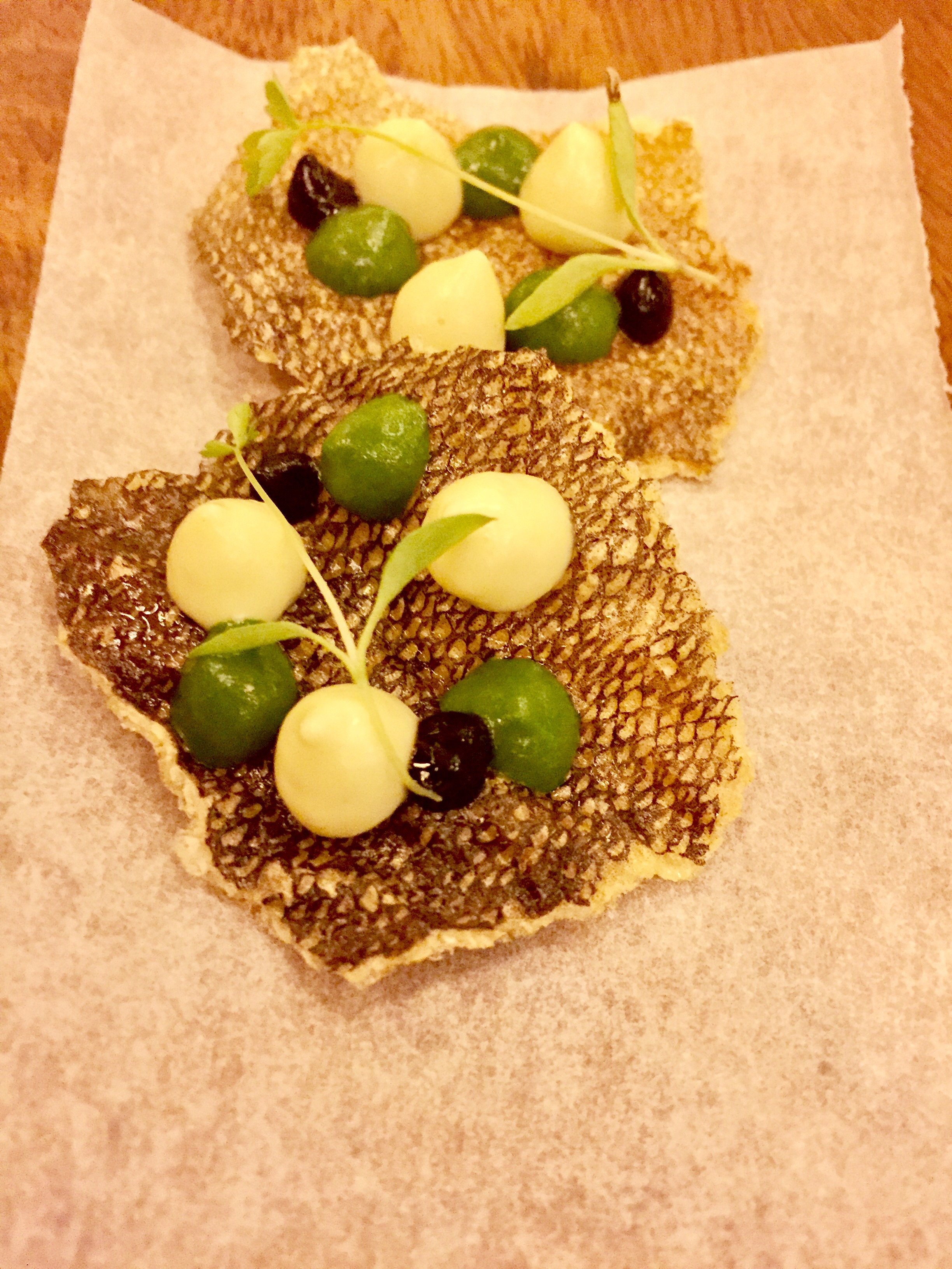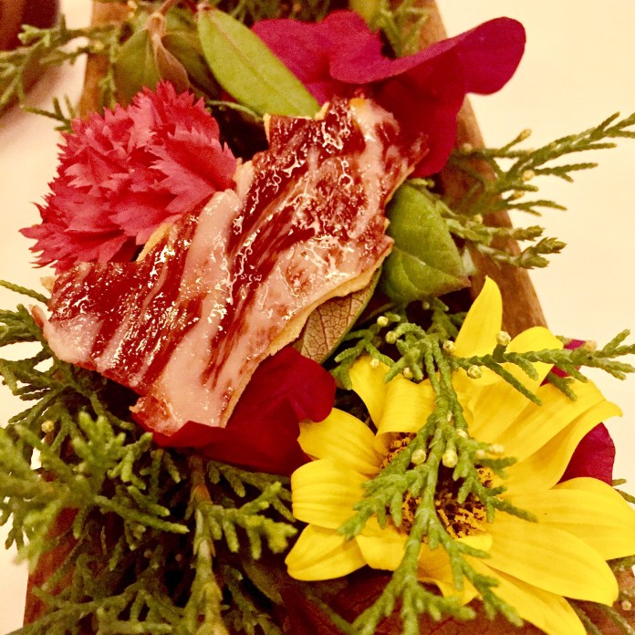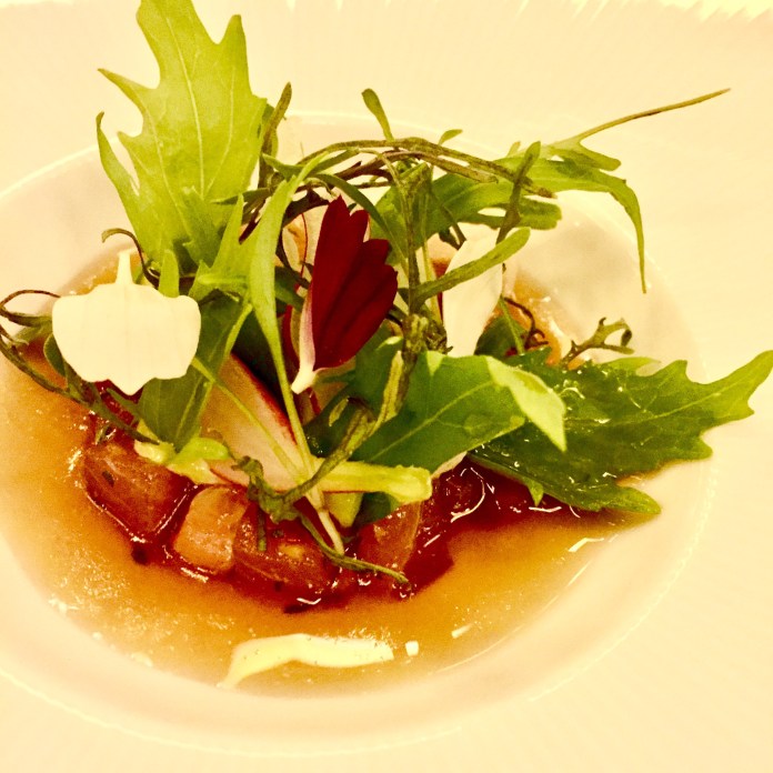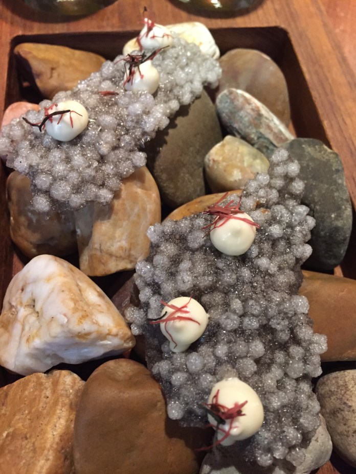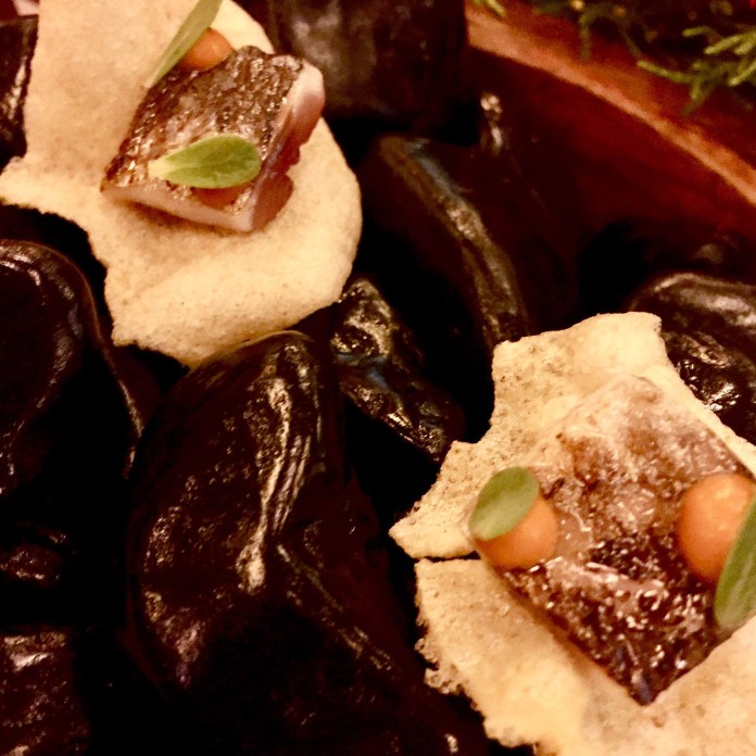Recién bebido, la mesa se llena con cuatro grandes aperitivos, uno de ellos escondido en un pequeño tiesto de flores multicolores: piedras (perfectas) que son intensos bombones de bacalao las blancas y de garbanzos las negras; una graciosísima cabeza de cerdo que consiste en unas láminas pintadas de remolacha con el picante relleno del recio embutido, aquí tratado como una crema; un crujiente y aromático temaki relleno de tartar de atún que es el que se esconde entre flores y para acabar, una deliciosa sardina a la plancha con un toque invisible de pimientos asados.