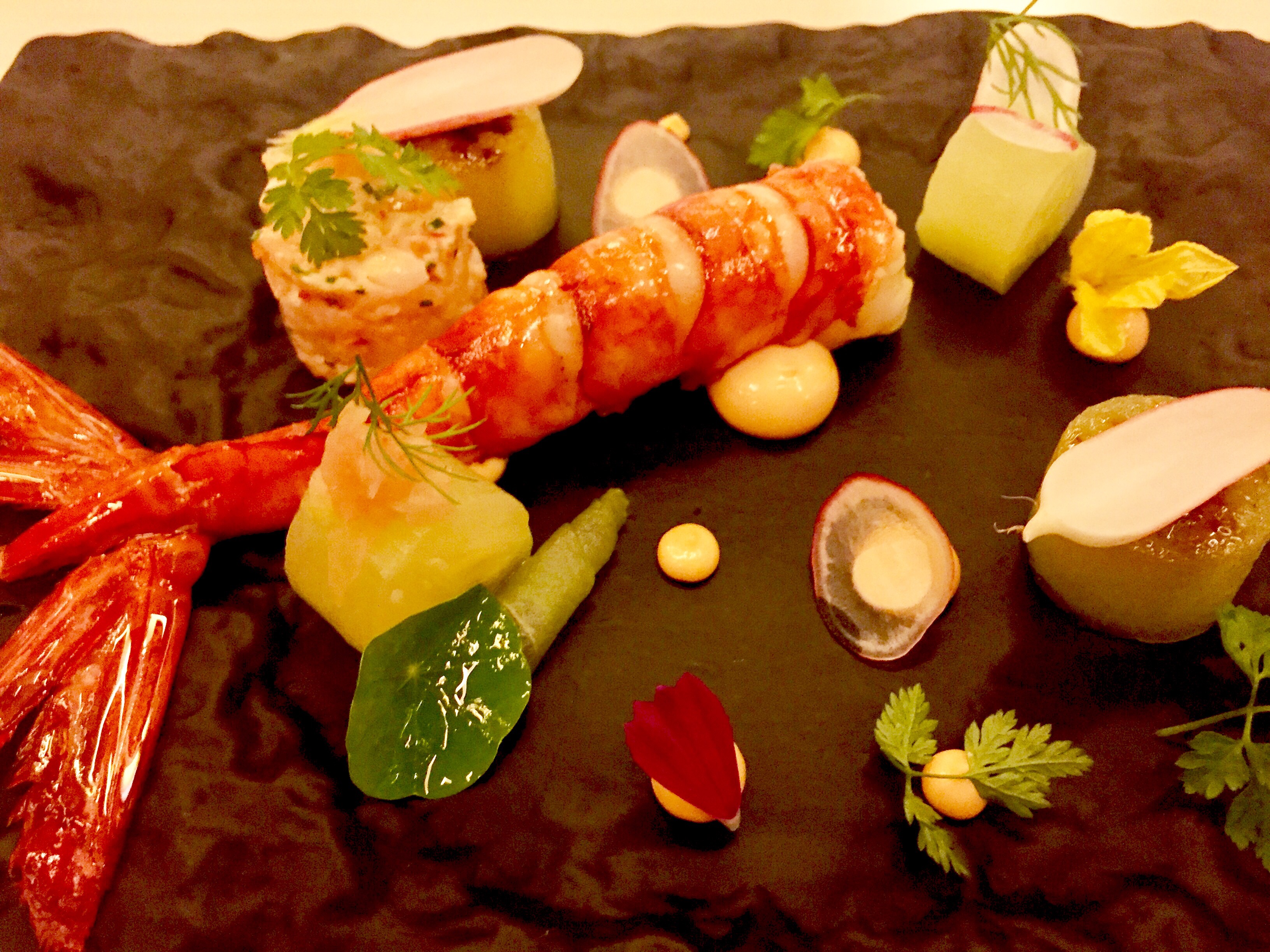 Y de repente, aparecen dos buenas cigalas que nos van a cocer al momento, poco para mi gusto pero da igual, mejor así semicrudas que pasadas y correosas. Están perfectas al natural y con un solo añadido de mayonesa de yuzu. Reposan sobre una cama de algas que he despreciado. Ya he pasado por muchas cosas y variados aprendizajes pero reconozco que a las algas, tal cual, aún no les encuentro la gracia.