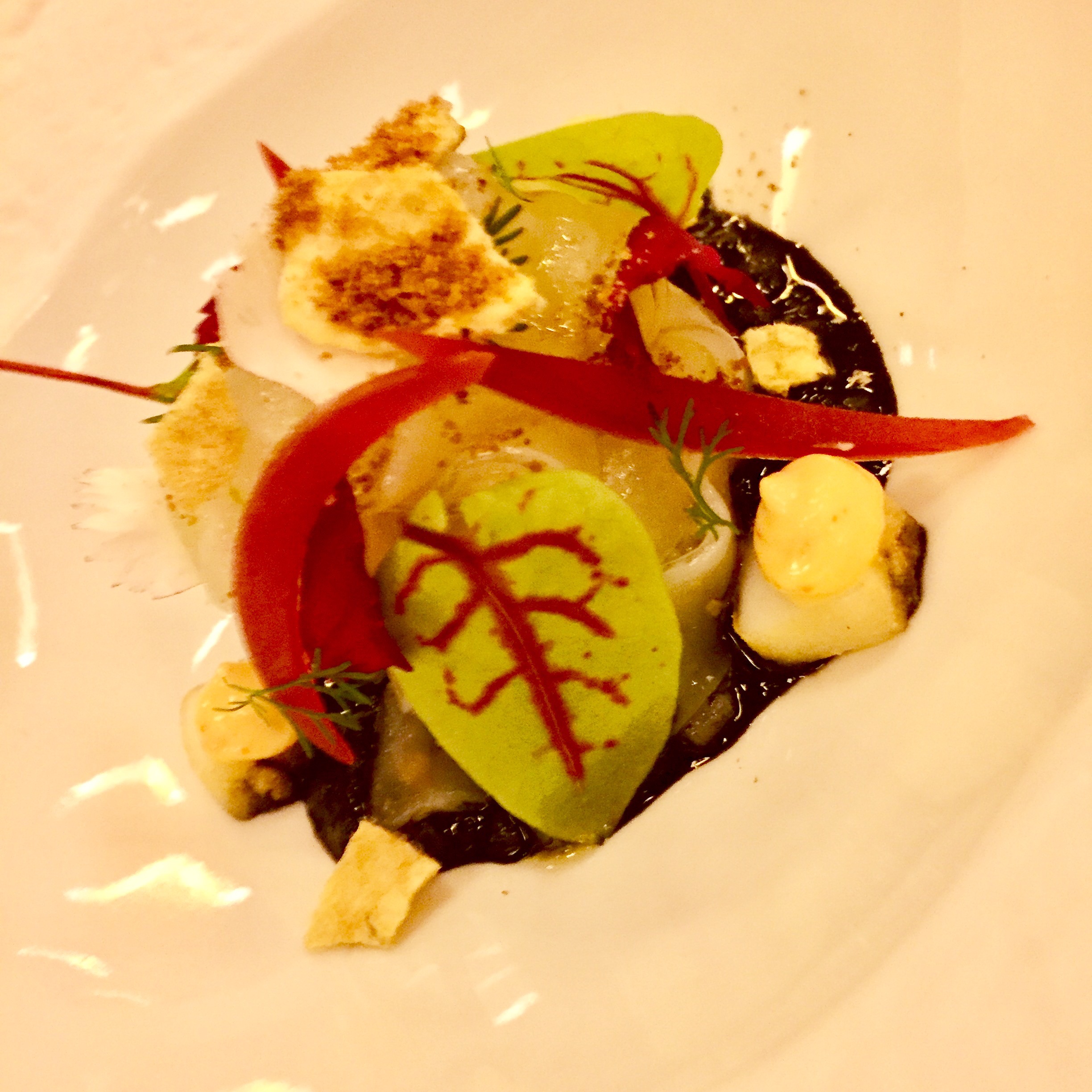 Aún estaba deleitándome con las cigalas, cuando aparece un maravilloso y enorme carabinero que llamaré real para así decir que a su lado la cigala parecía una pordiosera. El imperial carabinero se sirve en dos preparaciones: el opulento lomo con xarem, una papilla de maíz típica del Algarve, muy ligera y suave, perfumada con menta de la ribera, una variedad que a mí me ha recordado mucho al boldo por su fuerte aroma. La cabeza se presenta en una corteza de sal de remolacha y algas. Y qué puedo decir de los jugos de esa cabeza sino que estaban maravillosos y que me han hecho reconciliarme con el precio del menú.