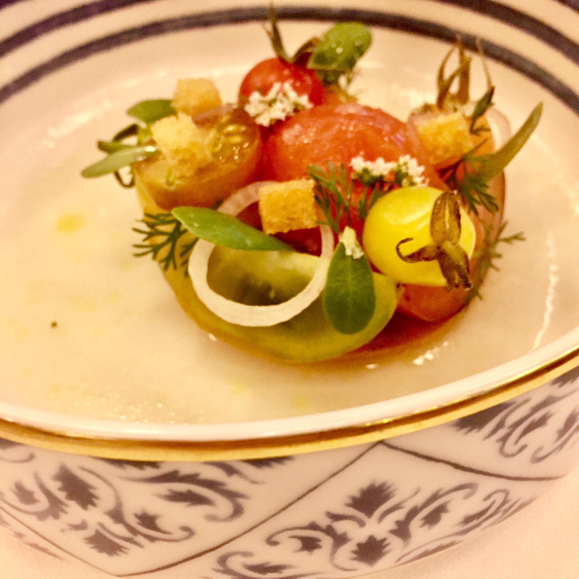 El jurel ahumado tiene un maravilloso sabor a madera quemada y se acompaña de una delicioso polvo de caldo de tomate helado con nitrógeno y una quebradiza tostada.