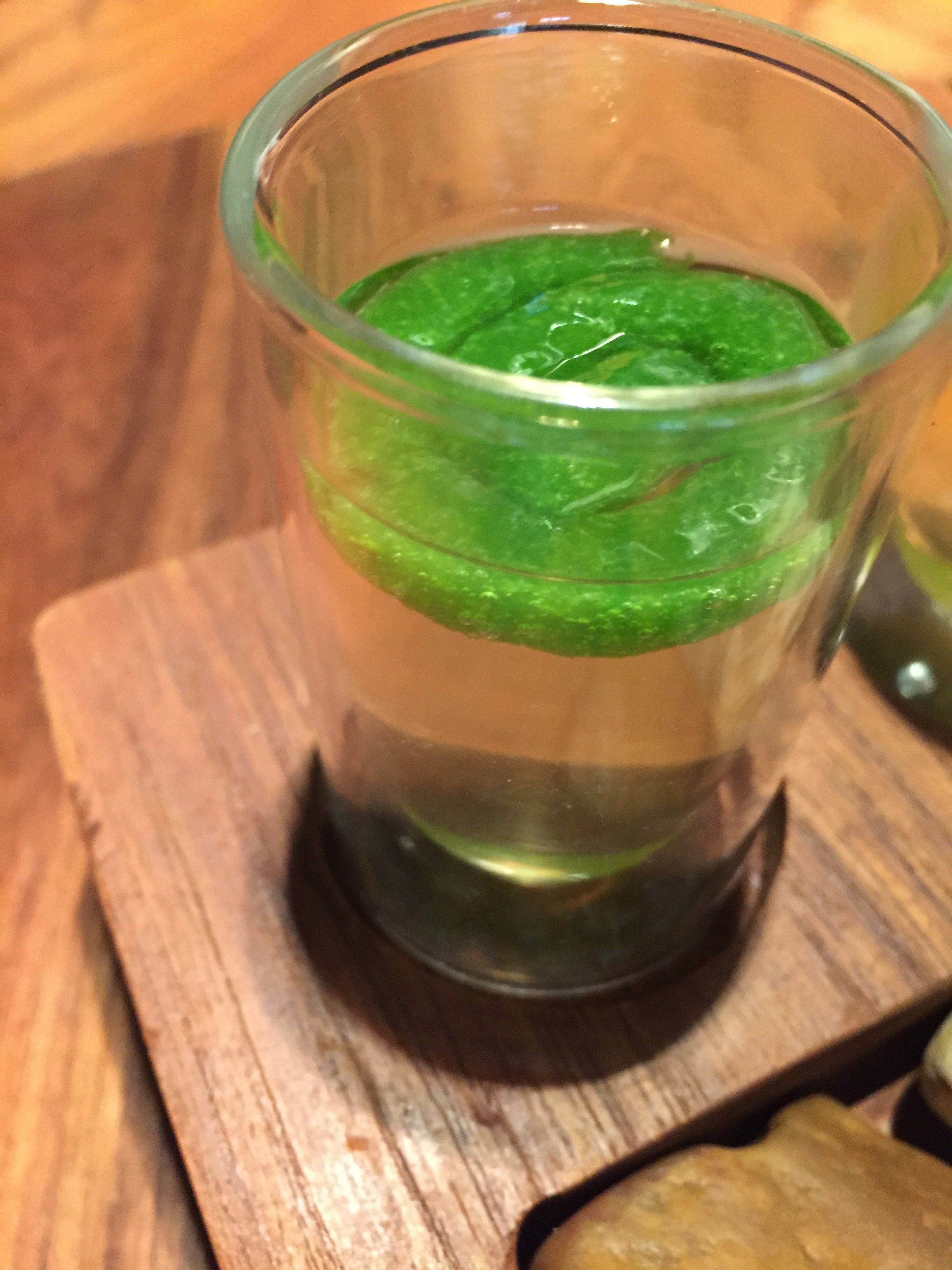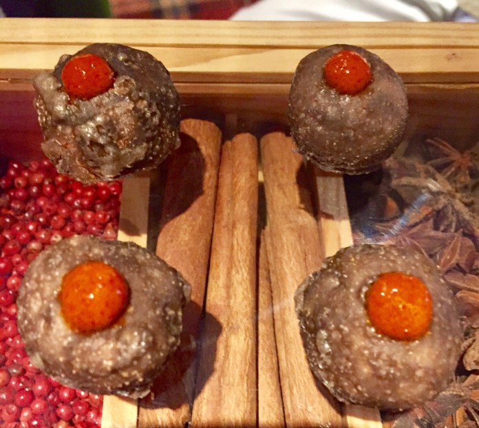 Por tanto, comencemos a ver si valió la pena. Todo empieza con una agradable versión del Dry Martini, en este caso un Dirty Martini que llaman Sabatini, no por el arquitecto sino por contener aromas a saúco -se dice sabugueiro en portugués- y unas agradables perlas de aceituna heladas. Menos mal, porque por un minuto pensé que serían las ya insoportable -por manidas- esferificaciones.
