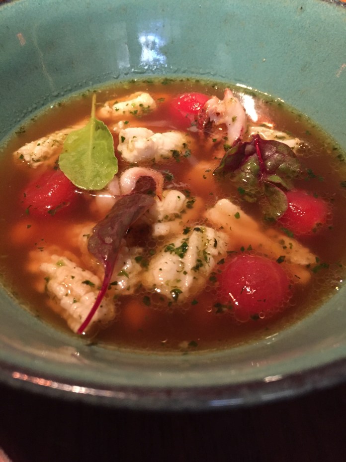 El calamar relleno con su arroz, no es tal sino más bien un suelto, sabroso, aromático y marino arroz de calamares coronado por una tiritas se calamar que ocultan, como el arroz, una ligera capa de tuétano que le da toda su untuosidad. Al lado las patas mezcladas con panceta. Grandes mezclas en pos de intensos sabores.