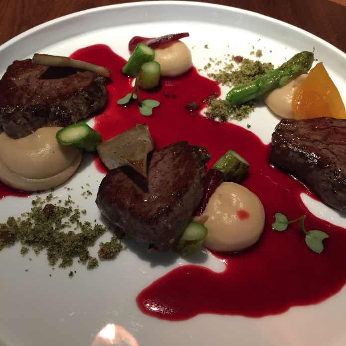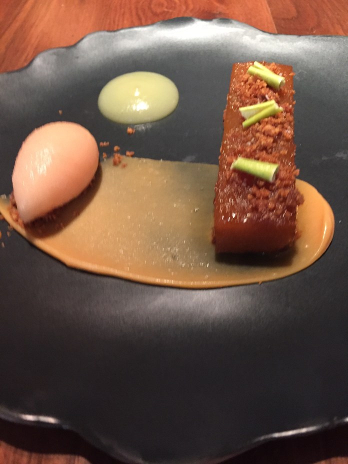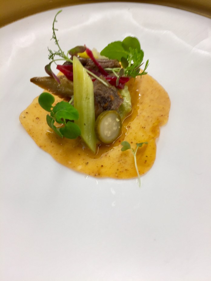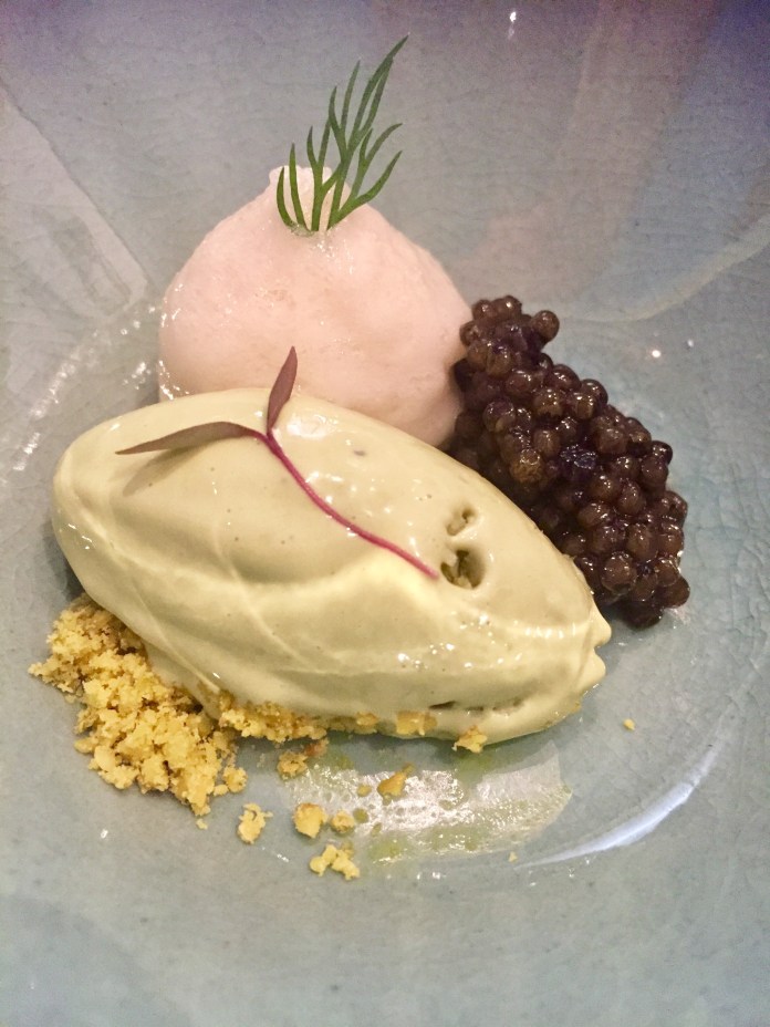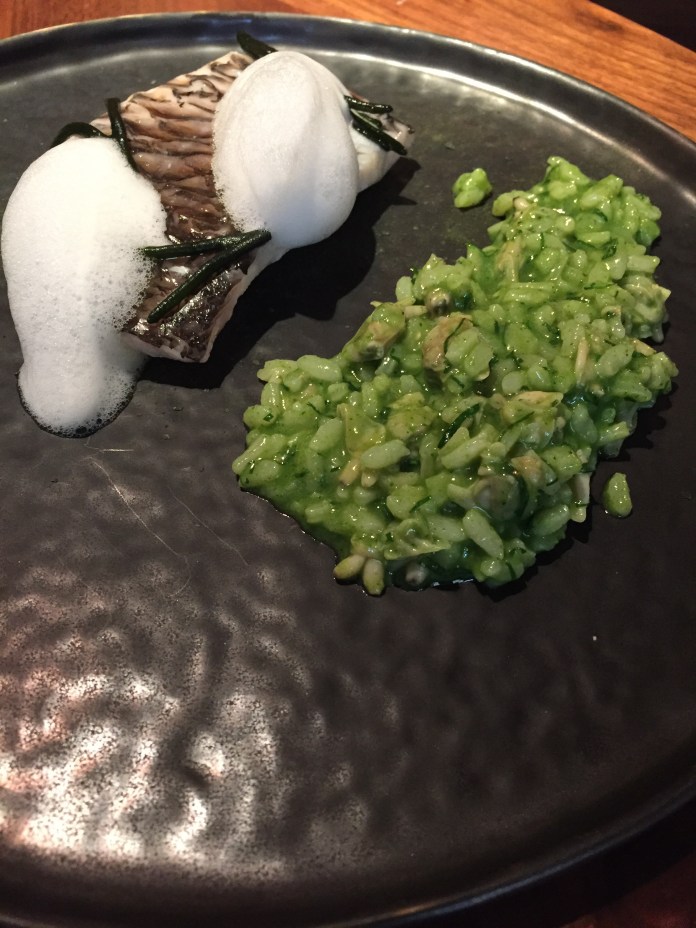 La lubina con aguacate ahumado es una gran preparación de pescado. La lubina, con un punto de cocción perfecto es tan extraordinaria que cualquier acompañamiento la puede arruinar. No así una leve crema de aguacate que, además de enbellecerla con un brillante caparazón verde, la realza con sus notas ahumadas como de fruta asada al carbón. Lleva también dashi, imagino que utilizado para la cocción y por eso el potente sabor de la otras veces muy suave lubina. Y de guarnición sorpresa, unos pedacitos de navaja.