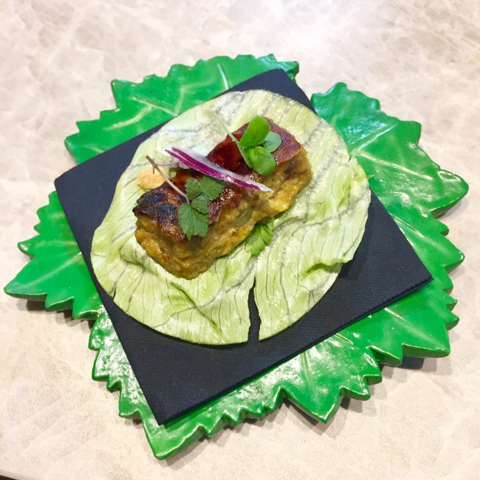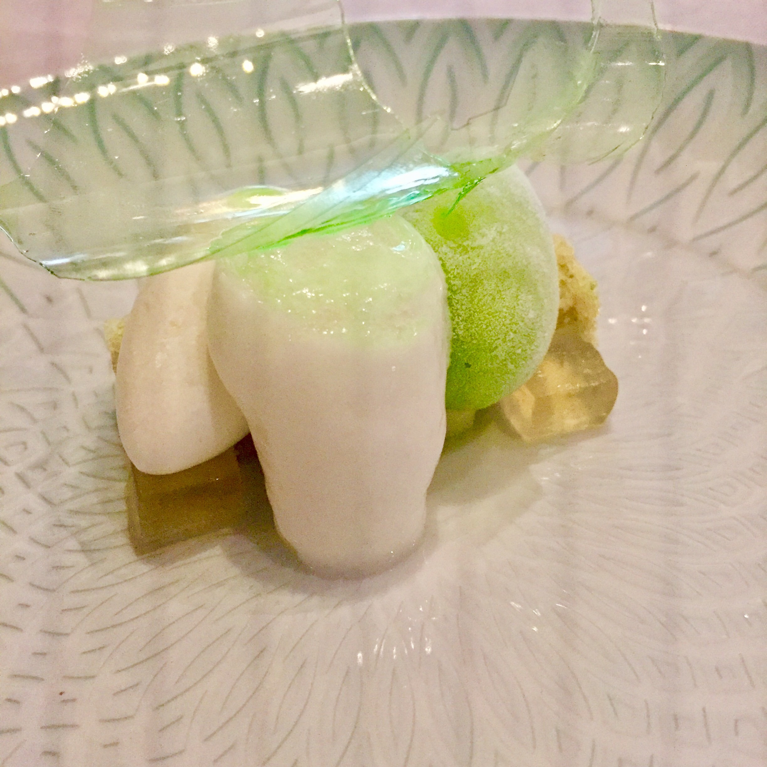 El ceviche de almejas a la Bulhao Pato es una brillante interpretación del clásico portugués. Para empezar parece un plato de guisantes pero las bolitas son diminutos sorbetes con todo lo que la salsa Bulhao Pato contiene: ajo y cilantro básicamente. En este caso, reforzados con un intenso sabor a lima que es lo que lo convierte el ceviche.