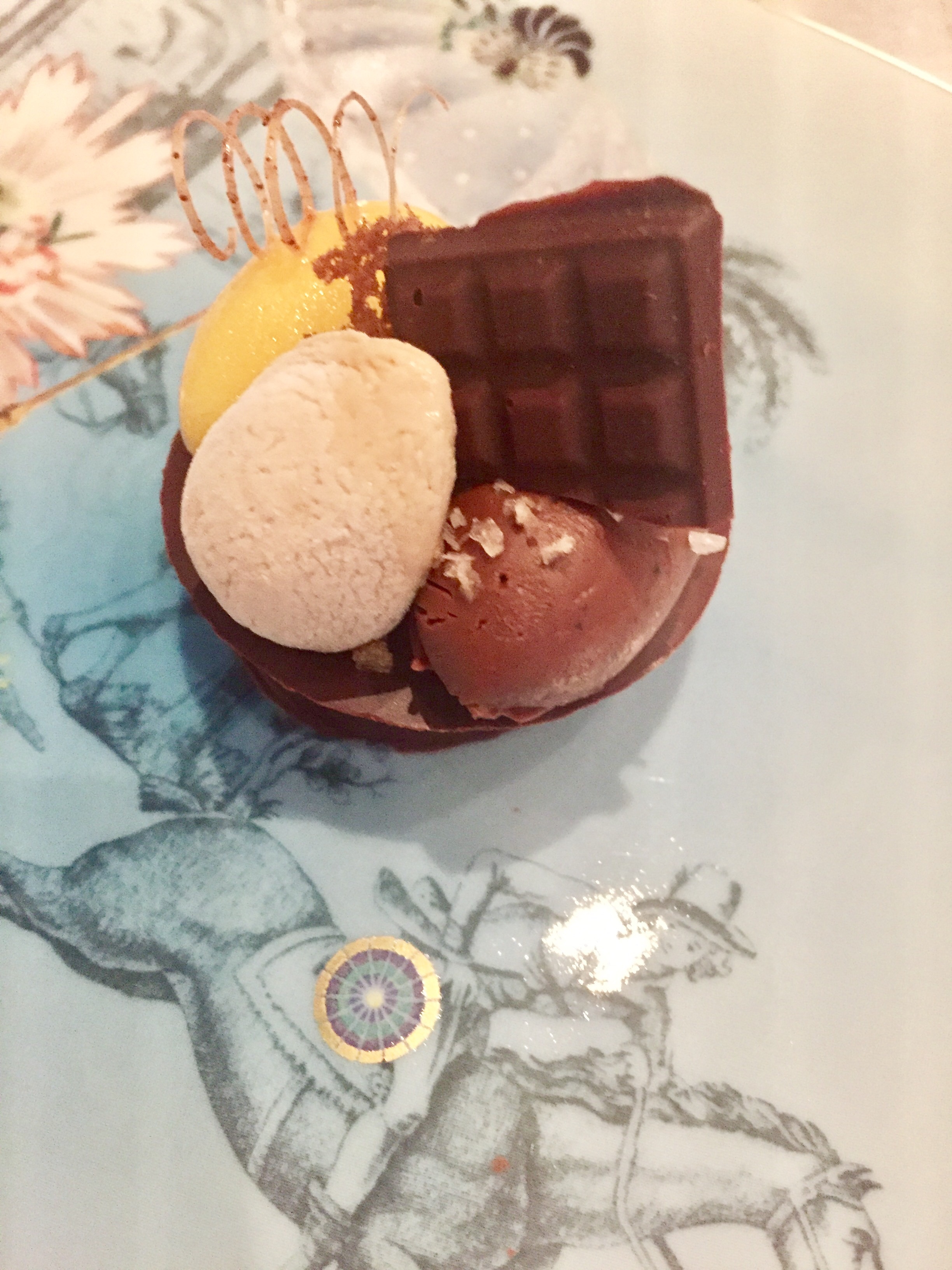 El primer postre choco, chocolate y tinta de choco es casi un shock. Parece como si, después de tantos años sin innovación alguna y cansados de tanta dulcería conventual, los chefs portugueses se hubieran lanzado a la revolución de los postres. En nada arriesgan tanto. Cuando aún tengo en las papilas, y en el recuerdo, el dulce de bacon y curry rojo de Loco, Avillez me enfrenta a un postre con algo de aceite y auténtica tinta. Tiene helado, crema y merengue; mezcla también cacao, avellana y cilantro. Raro pero muy bueno.