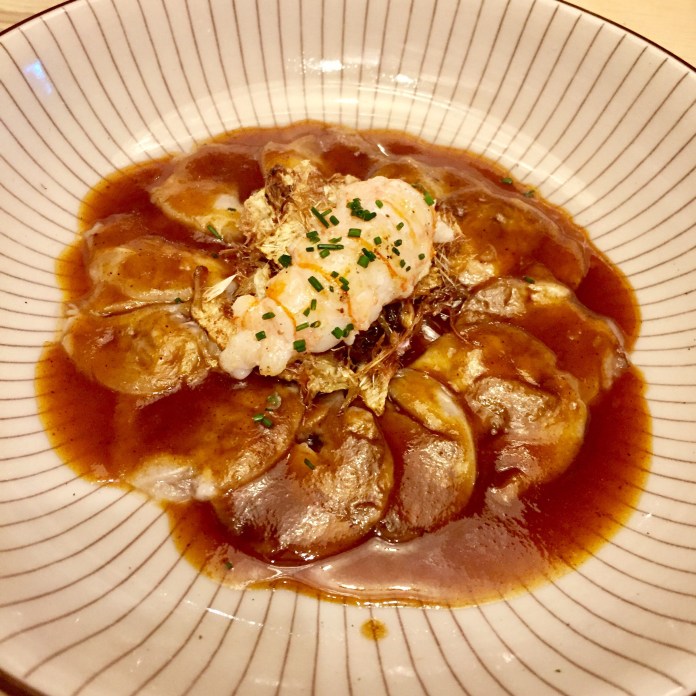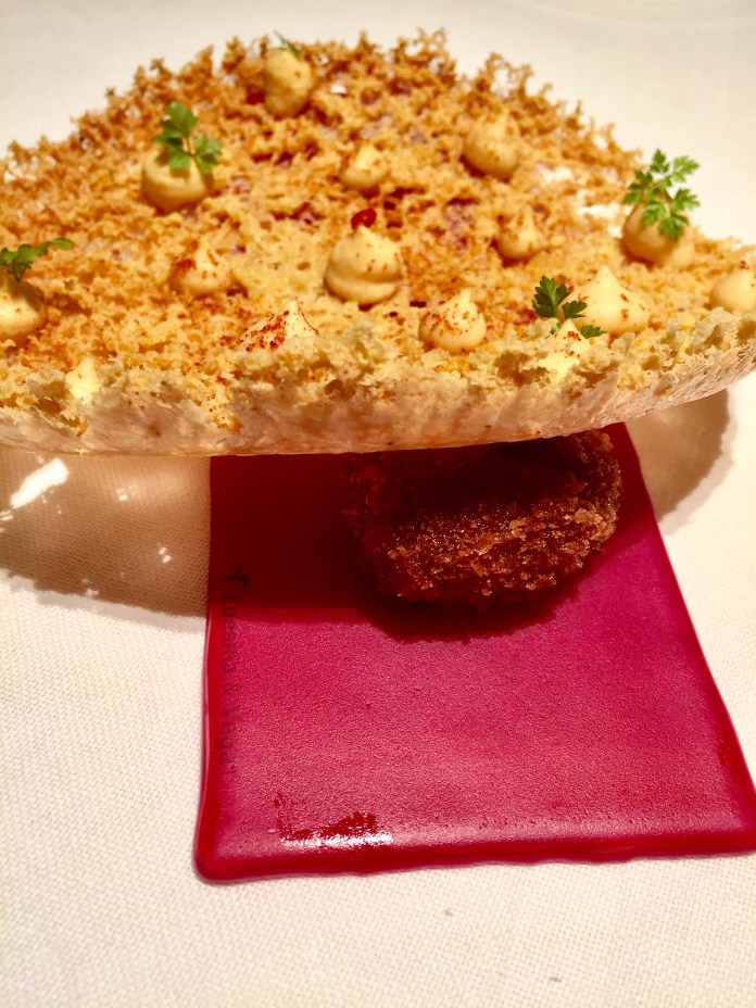 También me pareció una delicia y otra proeza técnica el huevo en tempura con su perfecta yema líquida, envuelta en un crujiente rebozo enjundioso, y sobre una cáscara que oculta una potente gelatina de setas, Una admirable delicia.