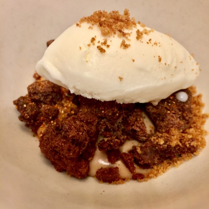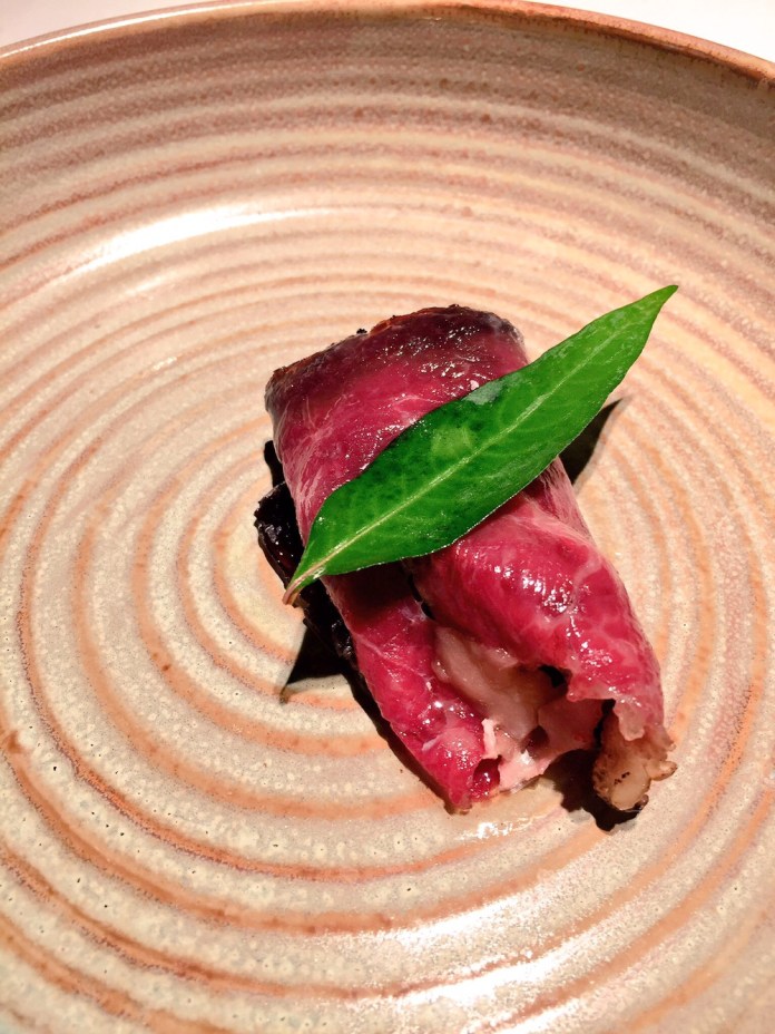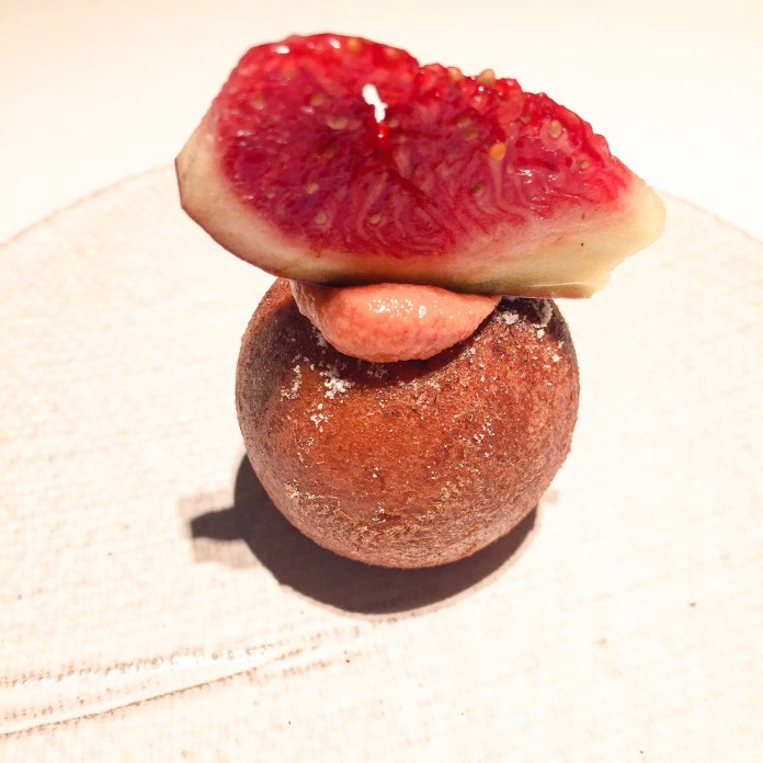 Estoy un poco harto de pichón. Así como es imposible concebir hoy un restaurante corriente sin pulpo o salmorejo, los grandes no se pueden pasar sin él. Hasta la exageración. Perdono a estos chefs de Disfrutar porque, sin comparación, este ha sido el mejor de la temporada. Un punto perfecto, increíblemente jugoso y tierno y unos compañeros que lo elevaban a la estratosfera: salsa de achiote, cilantro, cebolla encurtida, esfetificaciones de maiz y fresas semideshidratadas (atención, semi…) con sisho y miel. Y al lado, un inconmensurable bombón de foie y pichón.