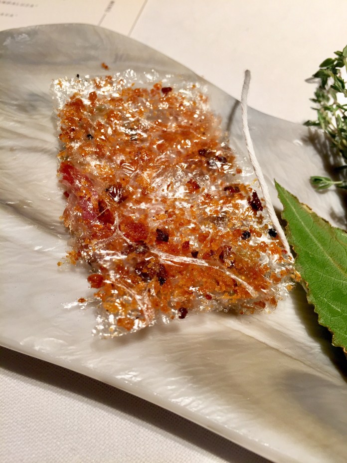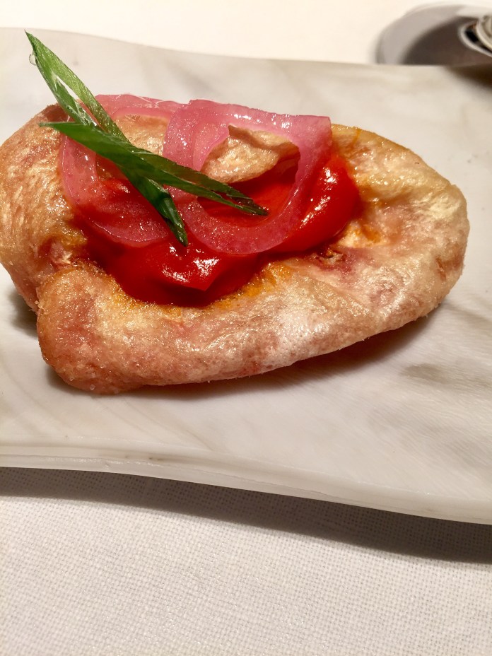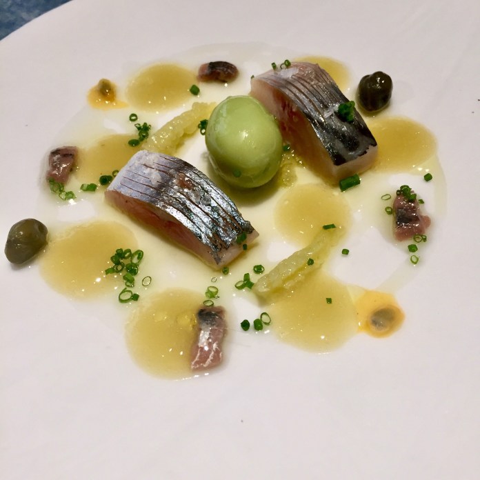 La gilda deconstruida me encantó. Fue volver a ese maravilloso y único mundo Adriano de las deconstrucciones, ahora tan habitual, antes tan revolucionario. Lleva por separado piparras, caballa, alcaparras, anchoa y aceituna esferificada. Se come todo junto y tenemos la más elegante y pura de las gildas.