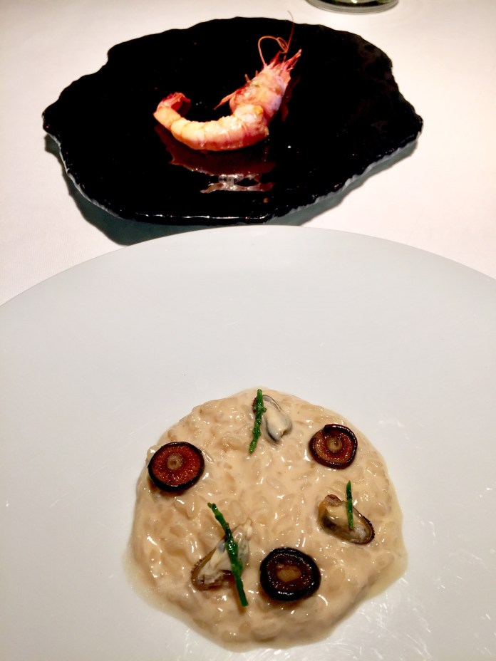 La siguiente receta es nuevamente original y muy creativa: navajas curadas en sal (en el frigorífico, no en el horno) que recuerdan visualmente al pescado al horno así preparado. Se sirven con aceite de arbequina, vinagre y algas. Muy sabroso, muy natural, muy original.