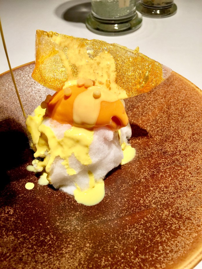 Tarta al whisky deslumbra. El ámbar de avellana y café es simplemte espectacular, una esfera de caramelo de auténtico color ámbar rellena de lo dicho. Antes nos rocían de whisky las manos para que el aroma sustituya al sabor. Una yema de huevo caramelizada completa la construcción gustativa de esta deconstrucción.