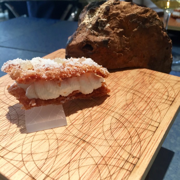 El sabrosísimo milhojas es otro alarde técnico y un festival de sabores. Falso hojaldre de queso relleno de crema de Idiazábal (ambos cremas) y sidra hecha al momento (está en la mesa desde el principio) con zumo de manzana, hielo seco y ahumados repentinos.