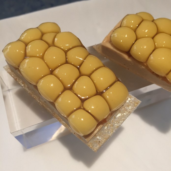 La hostia es una delicadusima base de obulato coronada con una crema muy perfumada de flor de mandarino.