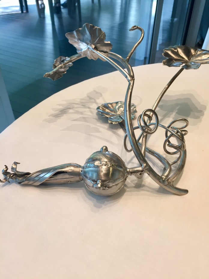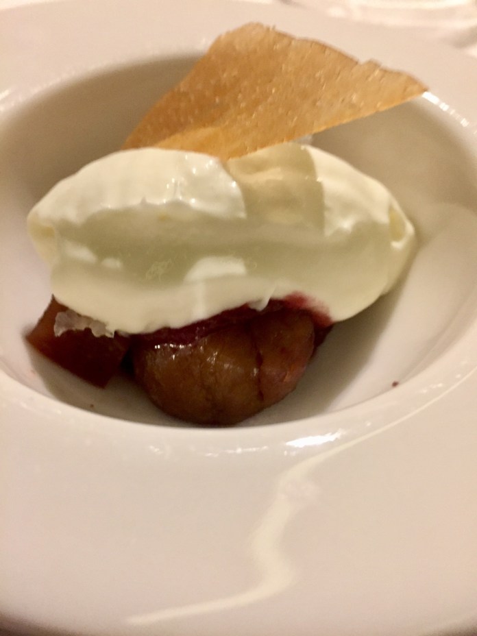 Estaba aún regodeándome en las setas cuando aparece el bogavante asado, tofe de sus corales, mantequilla de café y cebolla (morada) de Zalla, otra cumbre de belleza y conocimiento porque trata delicadamente al bogavante con aderezos suaves y consigue una bellísima composición púrpura en que rojas son hasta las flores de verbena.