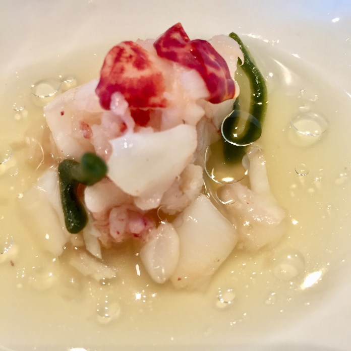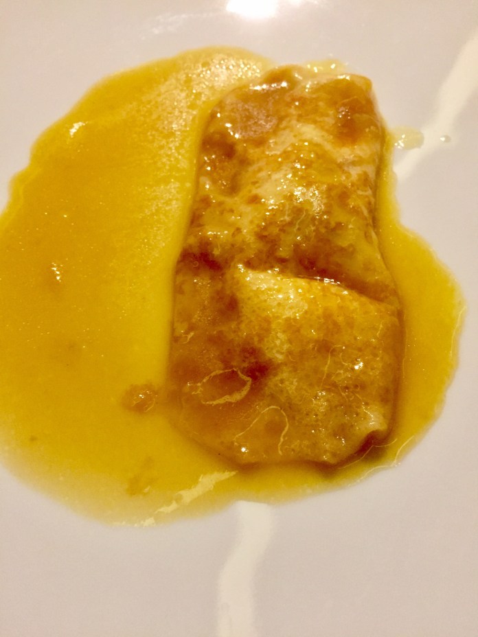 y un nabo marino con emulsión de hierbas y marinada. Tiene algo de algas. Parece una vieira pero es un humilde nabo convertido en marino por todas esas cosas.