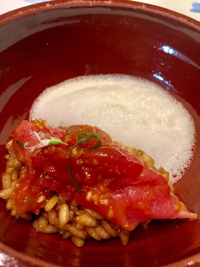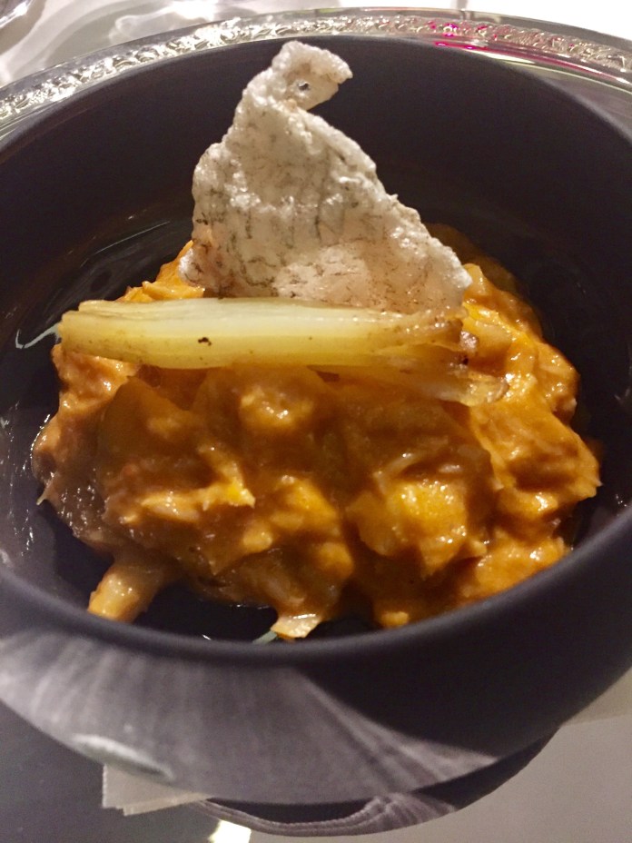 Otra bebida excelente: sidra pero hecha con manzana asada e infusión de hierbas (romero, tomillo y menta). Para acompañarla el cornetto de especias del mundo, a base de un curry que llaman local (guindilla, primenton, ajo…) y crujiente de tomate, emulsión de tomate y chips ajo. Crujiente, cremoso y todo tomate.