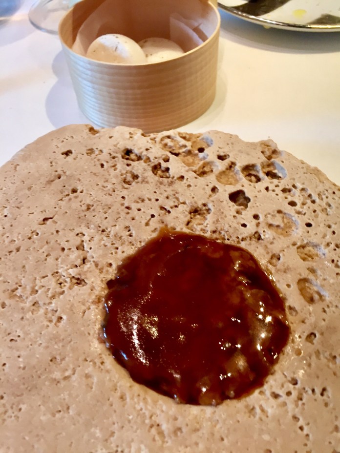 Sirven tres excelentes panes, adaptados a los diferentes platos. Mi preferido por su esponjosidad y tersura es el pan al vapor que llega con un excelente aceite oliva de La Rioja. Ya saben que creo que pocos europeos manejan bien estos vapores orientales. Pues bien, Eneko Atxa es uno de ellos.