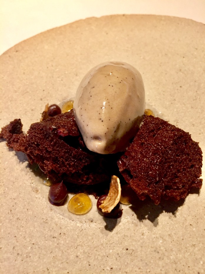 que continúa hasta el final porque oliva negra, leche de oveja y cacao es un estupendo postre que parece muy convencional hasta que aparece el sabor de la aceituna que contrasta increíblemente bien con el del cacao.