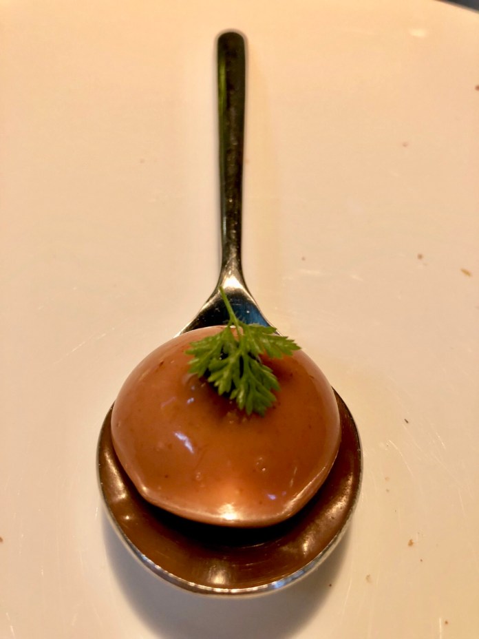 A continuación un bombón de queso manchego, servido sobre una cuchara, que me ha parecido de excelente sabor pero demasiado denso, lo que le confería una consistencia algo pegajosa.