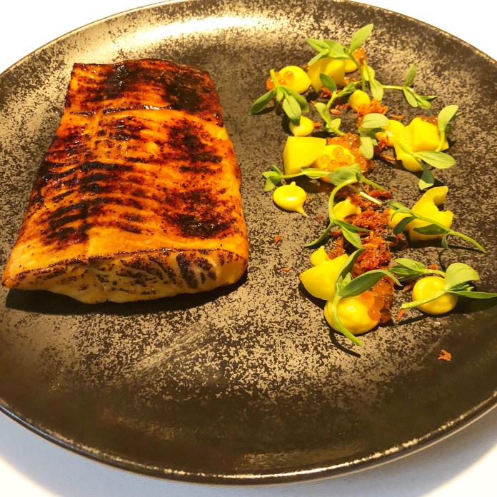 Hacia años que no veía trucha en una carta, así que no me he resistido a pedirla, sobre todo porque anunciaba que era asturiana y porque me han anunciado que era salvaje. También por otra infrecuencia: la guarnición de berenjenas de Almagro. Demasiada cosas para resistirme. Y he hecho bien porque me ha encantado. El pescado se marina y después se glasea, lo que le otorga bellos colores anaranjados y ocres y un sabor con un delicioso toque dulce. Las berenjenas tienen varias preparaciones -de crudas a puré- y su toque avinagrado contratasta a la perfección con el rubio dulzor del glaseado.