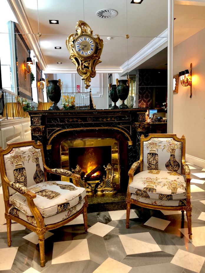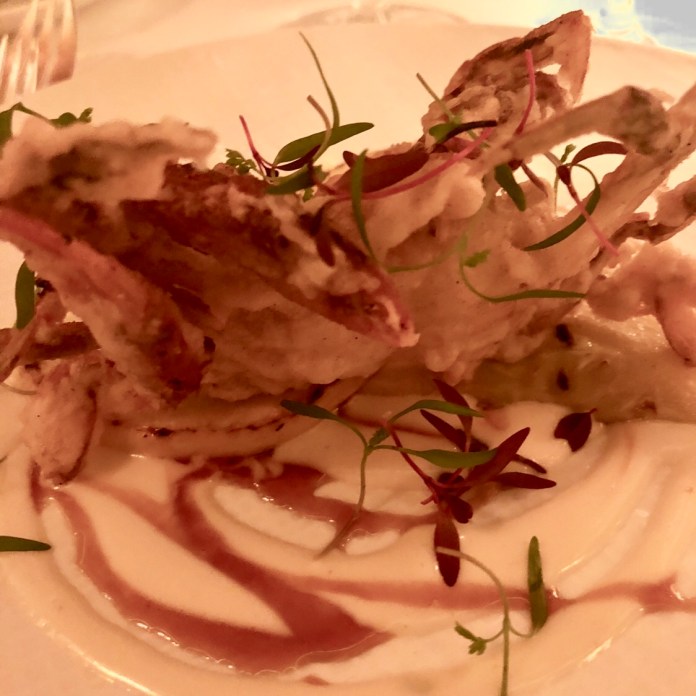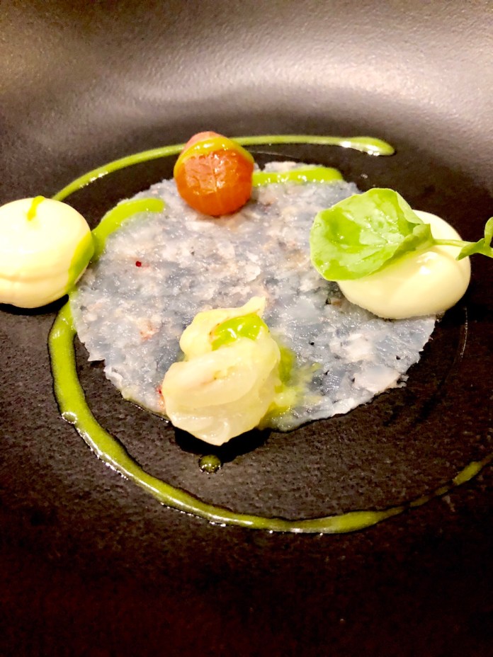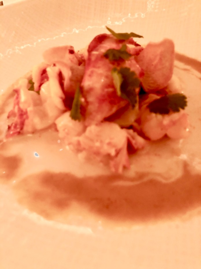 Lo primero que comemos es el maravilloso gazpacho de muchos tomates de Dani García, porque aunque aquí manda Paco Roncero, son varios de sus compañeros los que han prestado un plato. Este es un gazpacho más aromático y más untoso que el normal y en el que los tropezones son multicolores tomatitos y deliciosas almejas. Se sirve en una gran concha igualita a la que sustenta a Venus en el cuadro de Boticelli. Tiene hasta una perla que es una lámpara. Todas las paredes de la sala son un enorme fondo de mar.