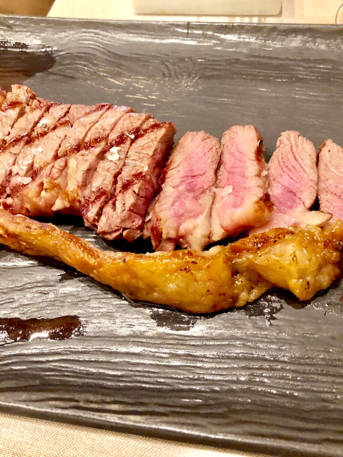 Sigue una inquietante escena de Eyes Wide Shut, con estética diabólica y masona, en la que se corta una carne que luego se envuelve en llamas por mujeres enmascaradas. Antes ha hecho otra espectacular aparición el Dom Perignon P2 del 2000, un champán verdaderamente impresionante. Y también el tinto (Termanthia) transportado por dos bellas piernas de mujer sin tronco ni cabeza, solo piernas (auténticas) que conducen un carrito. Acompaña bien a la carne que en realidad es atún. Pero como si lo fuera porque los magia de Toño Pérez, de Atrio la cocina como si de una presa se tratara.