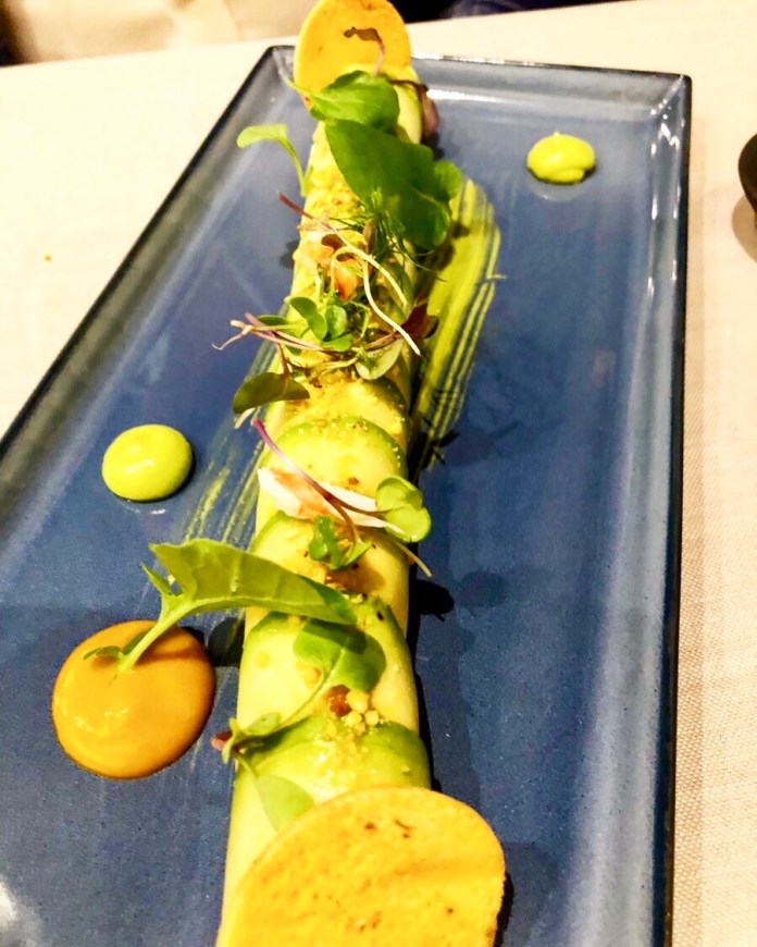 Allí se abre una puerta industrial y… empieza el espectáculo: un coqueto, kistch y deliberadamente hortera saloncito de flores se descubre ante nosotros. En él nos recibe una bella azafata, vestida de lo mismo, y un barman que nos dan la bienvenida entre cócteles de nitrógeno y galletitas heladas de miso y sésamo negro.