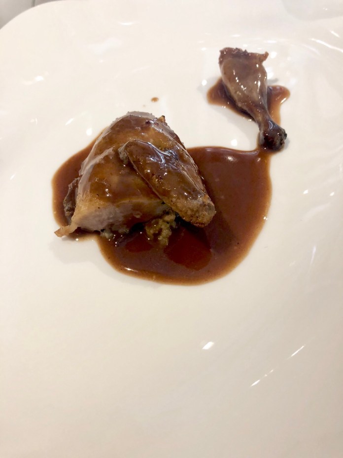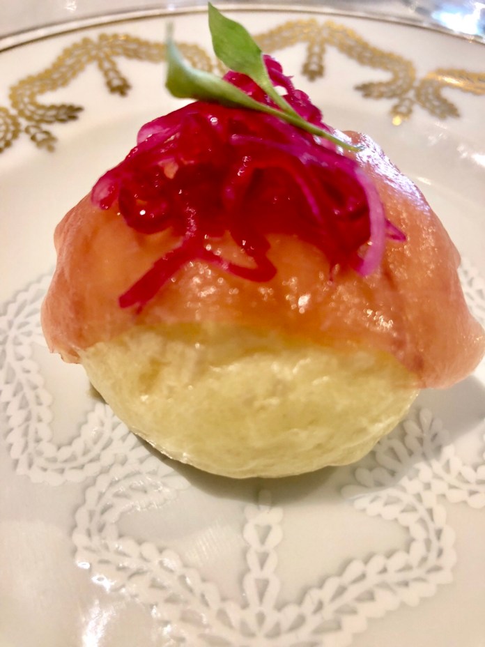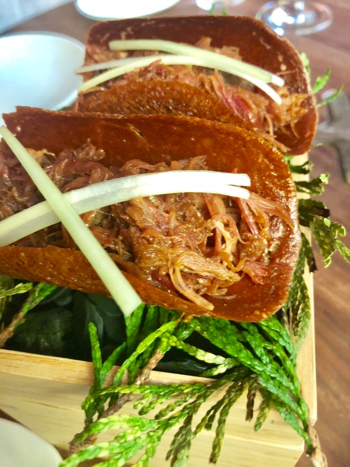 El taco de pato pequinés me gusta siempre. Este es de grasa de pato y almendra con un fuerte toque dulce. Como relleno un delicado pato desmenuzado, bañado en salsa hoisin y coronado de láminas de puerro y pepino; en el fondo una composición del pato pequinés bastante tradicional pero con la original sustitución de la crepe por el taco.